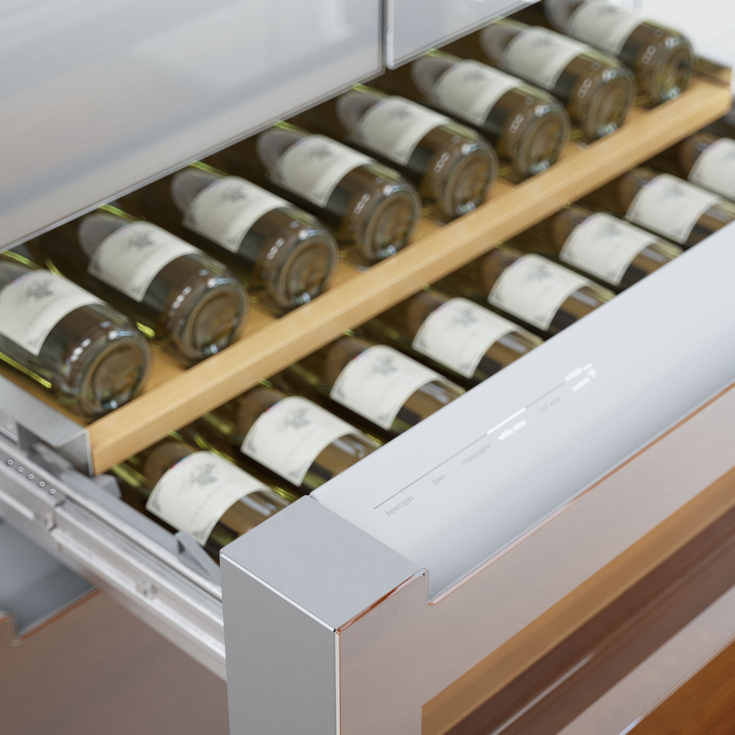 Glass display drawer holds up to 17 standard wine bottles