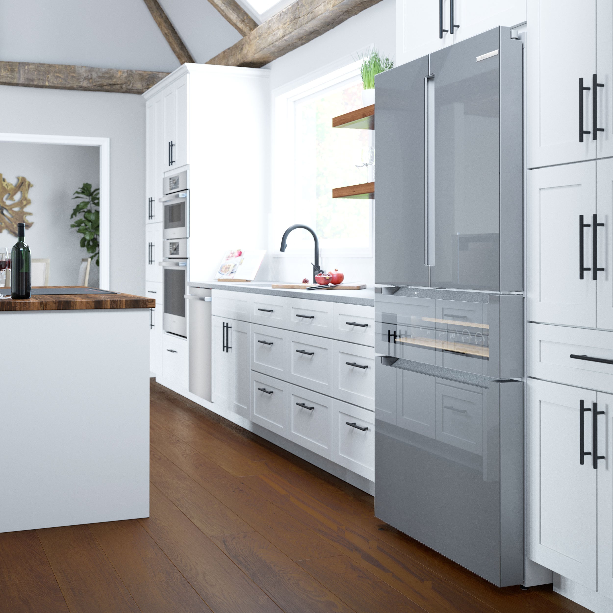 The new Bosch Refreshment Center refrigerator features an easy-to-clean glass over stainless steel exterior with a glass display drawer that holds up to 17 standard wine bottles or 35 standard beverage cans. Pre-programmed settings take the guesswork out of finding the optimal temperature. From craft beer and wines, to champagne, juice, and other beverages. Plus, Home Connect lets you easily manage your Bosch refrigerator from the convenience of your smartphone or tablet.