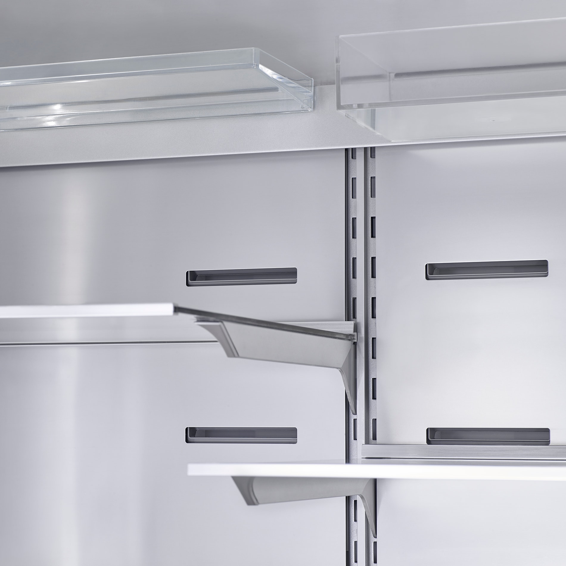 This freestanding refrigerator sits flush with the countertop, features hidden hinges, and discreet tucked away feet, all to give you a true built-in look and feel