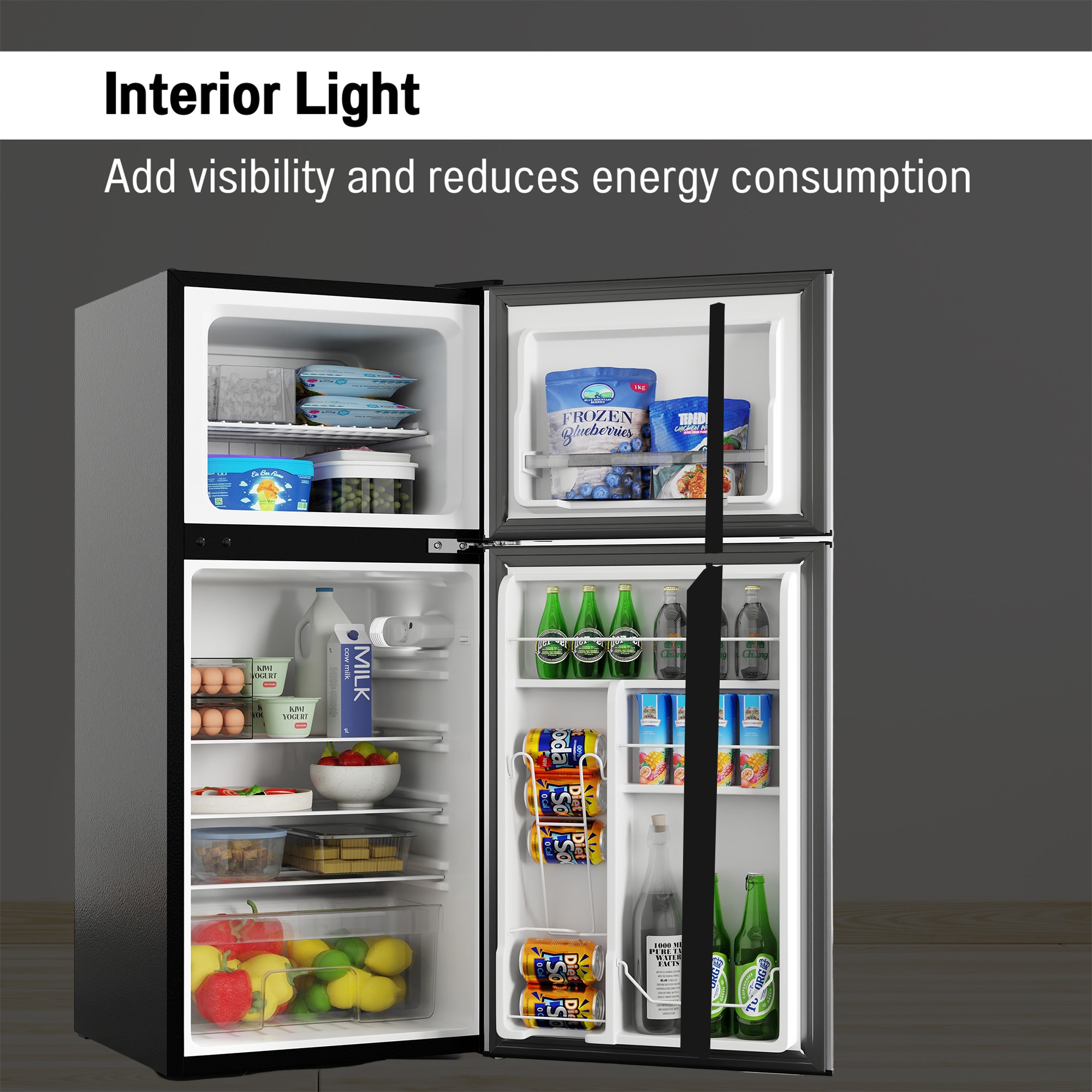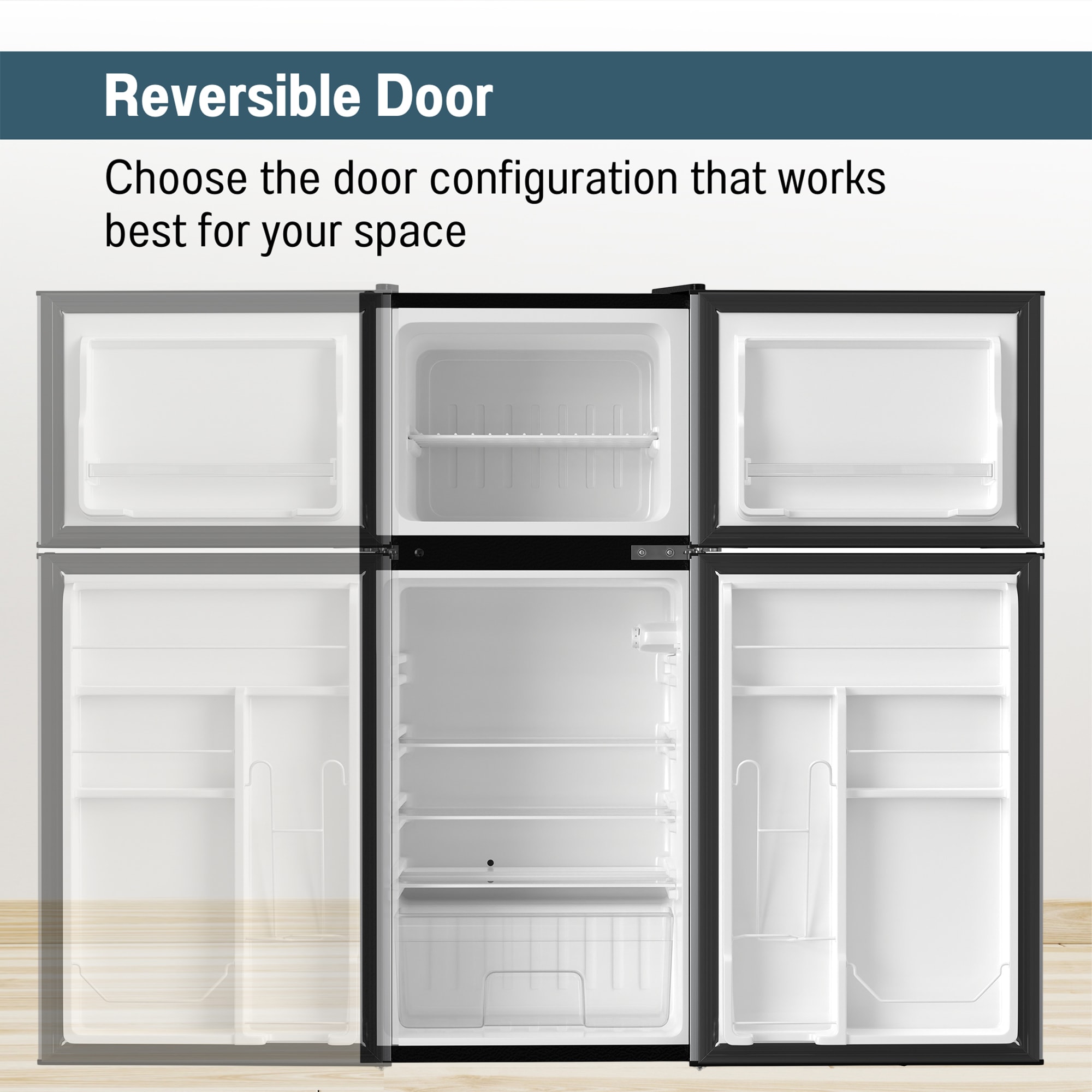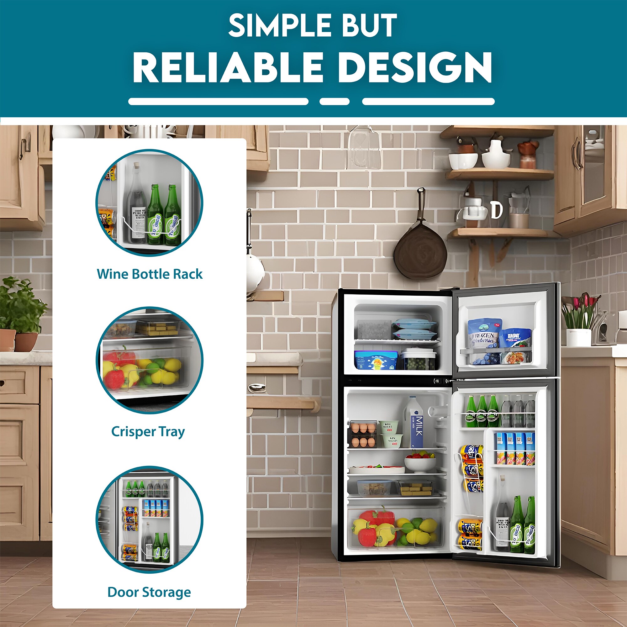 Short on space but in need of ample storage for your favorite foods and beverages? The ConServ 4.5 Cu. Ft. Stainless/Black Compact Refrigerator Freestanding Compressor Cooling is the ultimate cooling solution for small spaces. Measuring 43 x 19.1 x 20.1 (HxWxD in inches), and weighing just under 59.5 pounds, this freestanding appliance can effortlessly be moved between rooms as needed. Inside the refrigerator, there is 3.17 cu. ft. of storage space, and in the freezer, there is 1.35 cu. ft. of room. The unit is powered by reliable, eco-friendly compressor cooling. Easily set the temperature of the refrigerator between 32°F to 50°F, and the freezer between 6.8°F and -4°F. When organizing the contents of the CRF 450, enjoy the convenience of using a crisper tray, two glass shelves, and a wire bottle rack. You can also store up to six cans in the built-in door can dispenser. Other noteworthy features include an interior light, reversible door, adjustable legs, and manual defrosting. UL certified.