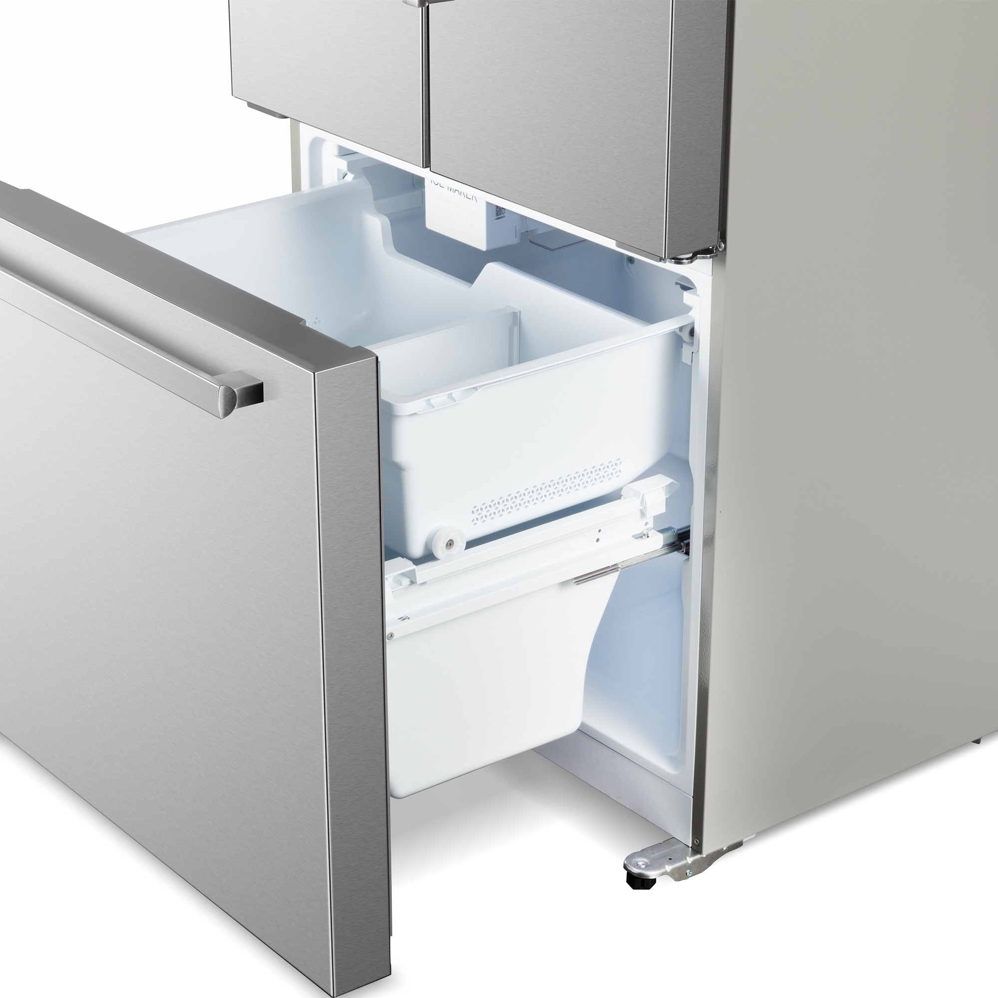 Introducing Cosmo’s COS-RFFV183GHS 17.5 cu. ft. Counter Depth French Door Refrigerator, featuring a sleek, fingerprint-resistant stainless steel finish. This thoughtfully designed refrigerator seamlessly integrates into any kitchen, providing ample storage and essential features to keep your food fresh and organized. It boasts a spacious bottom freezer with a removable ice bin for easy access. Adjustable shelves with fully enclosed crisper drawers offer valuable storage options, accommodating a wide range of foods. Valuable features such as energy-efficient LED lighting and a hidden hinge enhance its adaptability to any kitchen space. With advanced preservation technology, this refrigerator ensures optimal storage temperatures for your convenience, making it a perfect addition to your home.