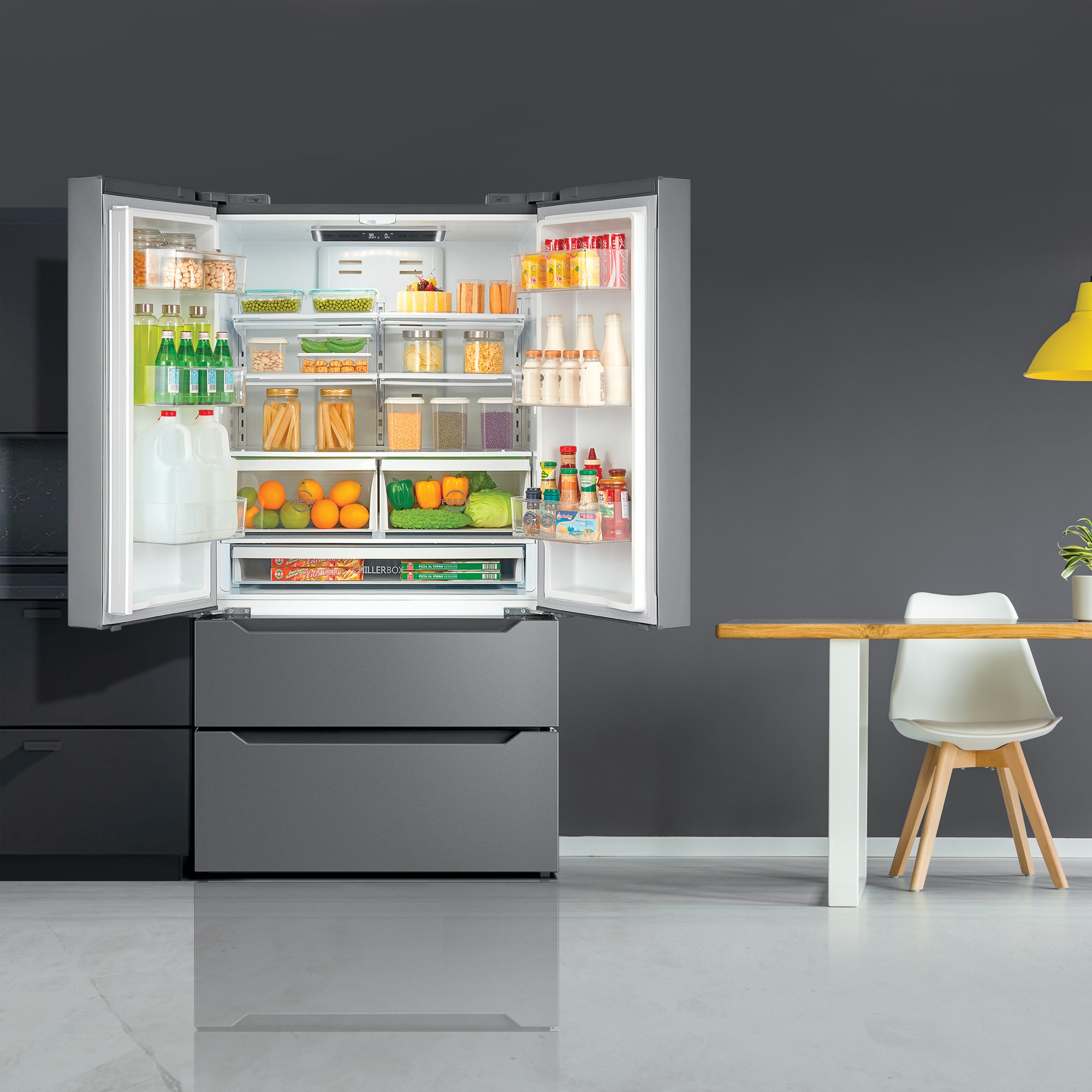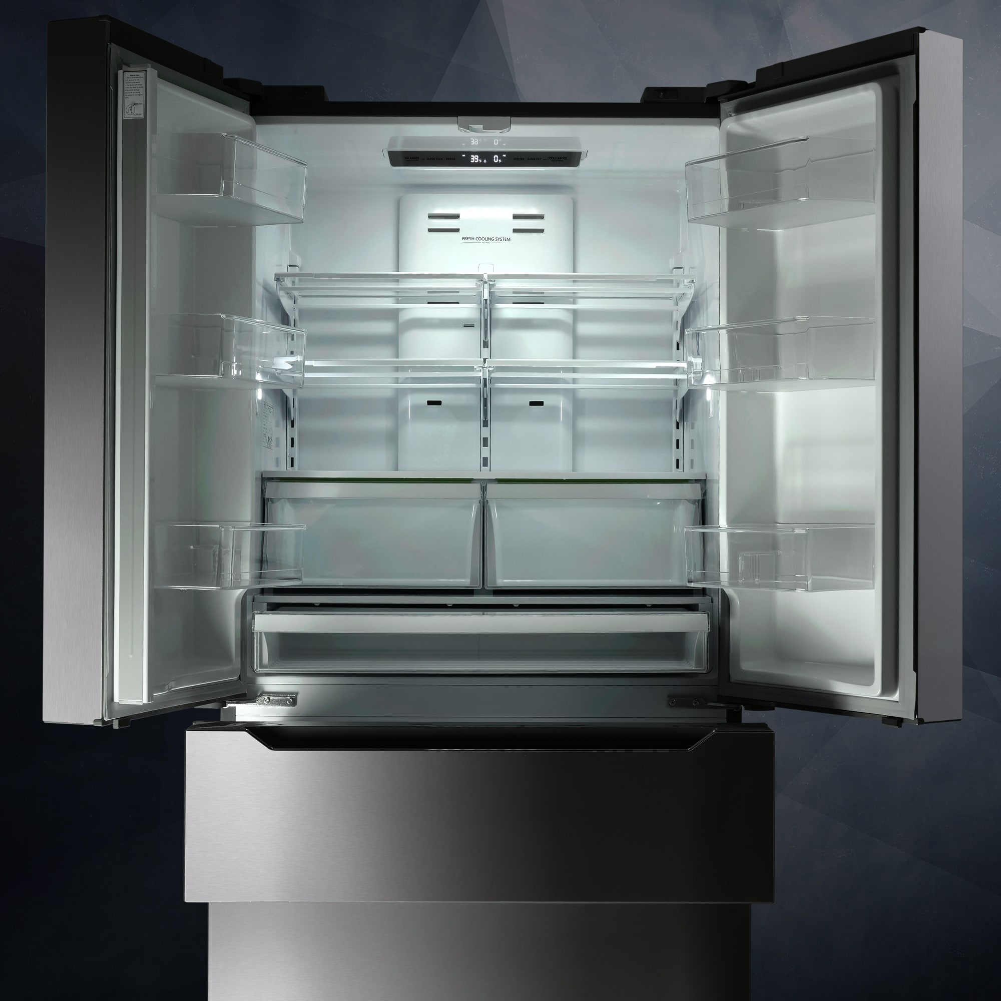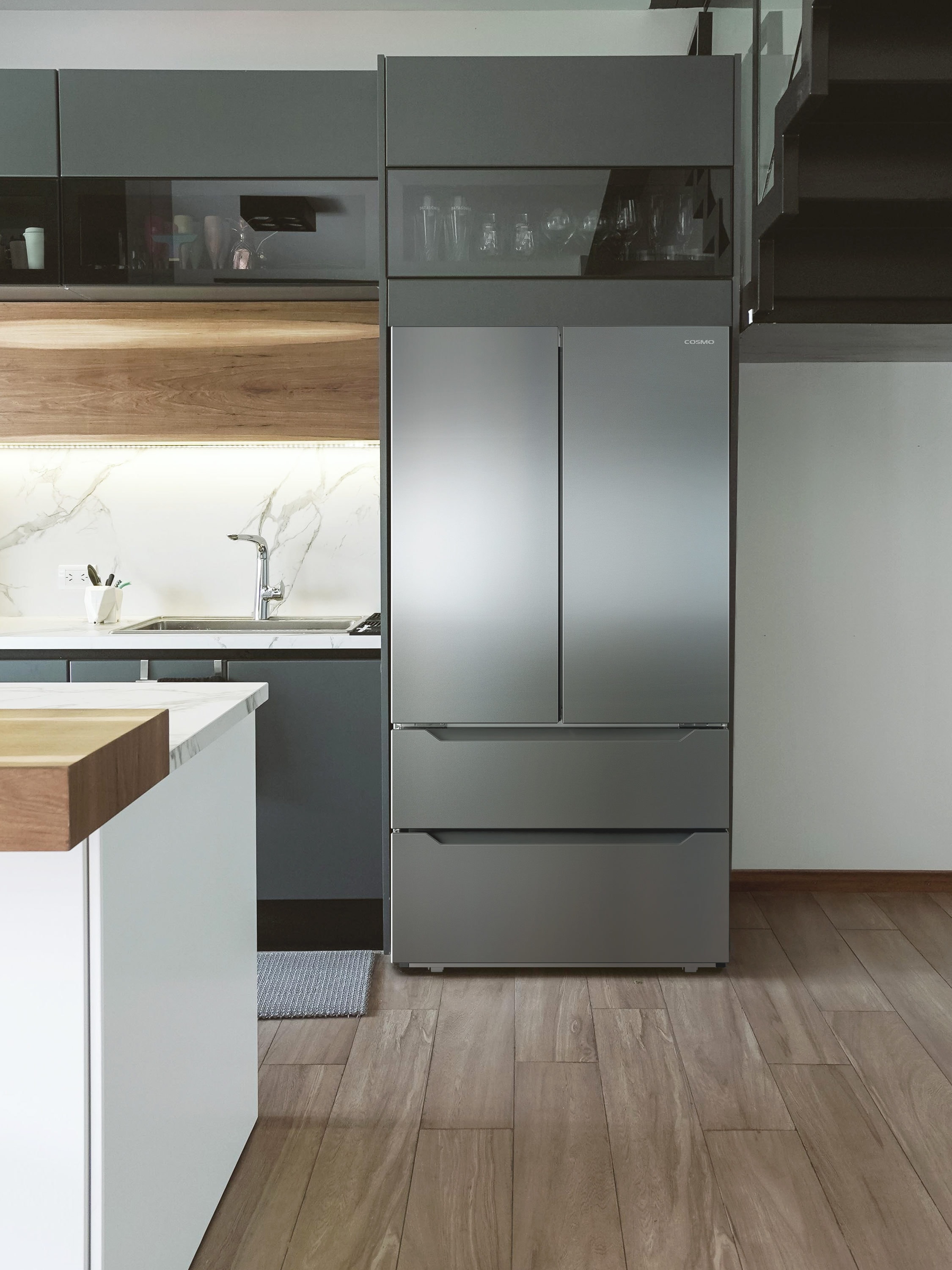 Cosmo’s counter depth French door refrigerator with 22.5 cubic foot capacity has a sleek high-end minimalist aesthetic and impressive, innovative features. This spacious bottom-freezer refrigerator offers organizational versatility for effortless storage and access to a wide range of foods from meats to fresh produce. Fully extendable freezer drawers, adjustable shelves and energy-efficient LED lights provide a clear view of all your fresh food. Our advanced preservation technology ensures you experience pleasure and convenience on a whole new level with perfect storage temperatures for maintaining fresher fruit, vegetables, fish, meat and dairy products. Our refrigerator is energy star rated to save you money on your electric bill.