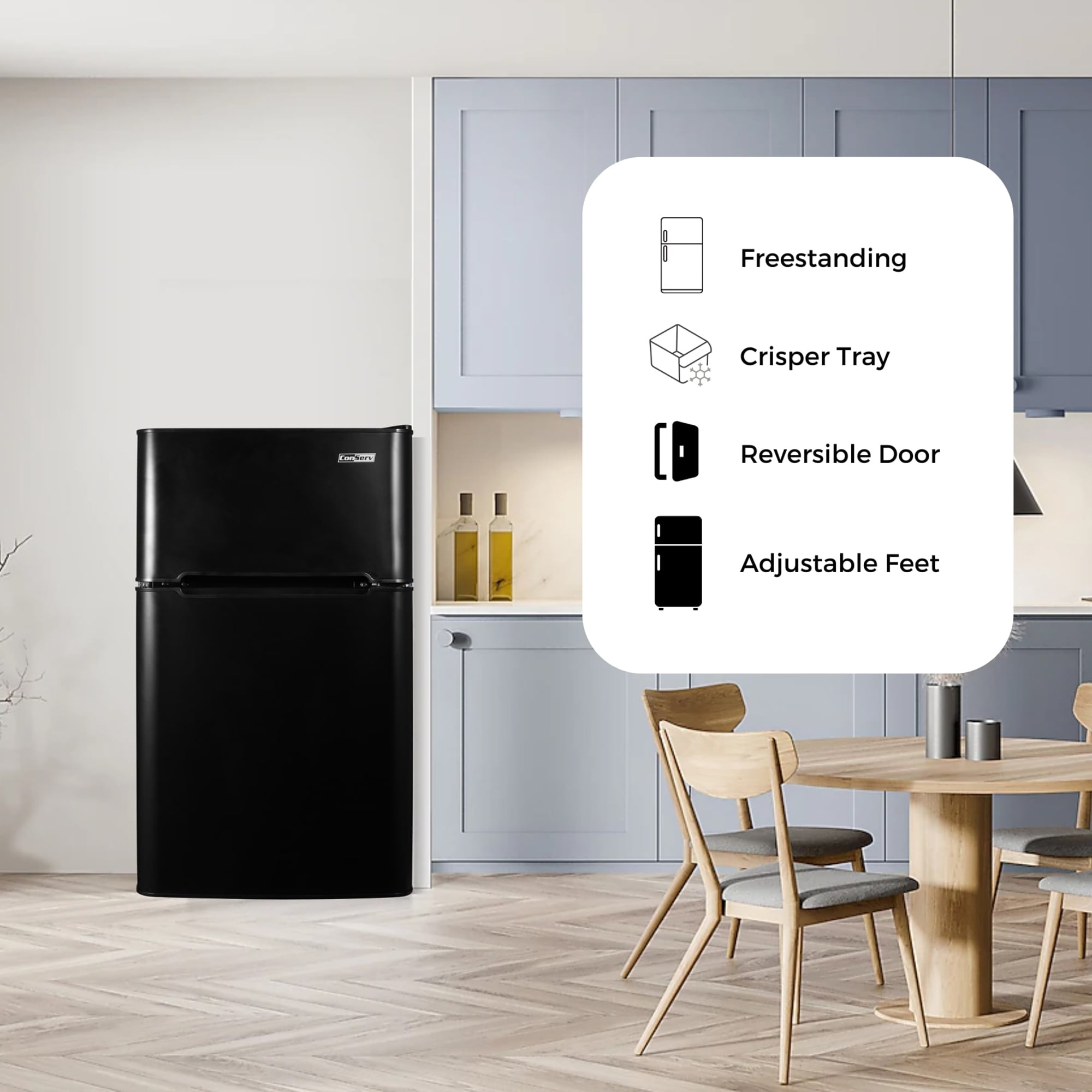 Short on space but in need of ample storage for your favorite foods and beverages? The ConServ 3.20 Cu. Ft. Stainless Compact Refrigerator Freestanding Compressor Cooling is the ultimate cooling solution for small spaces. Measuring 33.5 x 18.9 x 19.9 (HxWxD in inches), and weighing just under 58 pounds, this freestanding appliance can effortlessly be moved between rooms as needed. Inside the refrigerator, there is 2.24 cu. ft. of storage space, and in the freezer, there is 0.93 cu. ft. of room. The unit is powered by reliable, eco-friendly compressor cooling. Easily set the temperature of the refrigerator between 32°F to 50°F, and the freezer between 6.8°F and -4°F. When organizing the contents of the CRF 320, enjoy the convenience of using a crisper tray, two glass shelves, and a wire bottle rack. You can also store up to six cans in the built-in door can dispenser. Other noteworthy features include an interior light, reversible door, adjustable legs, and manual defrosting. UL certified.