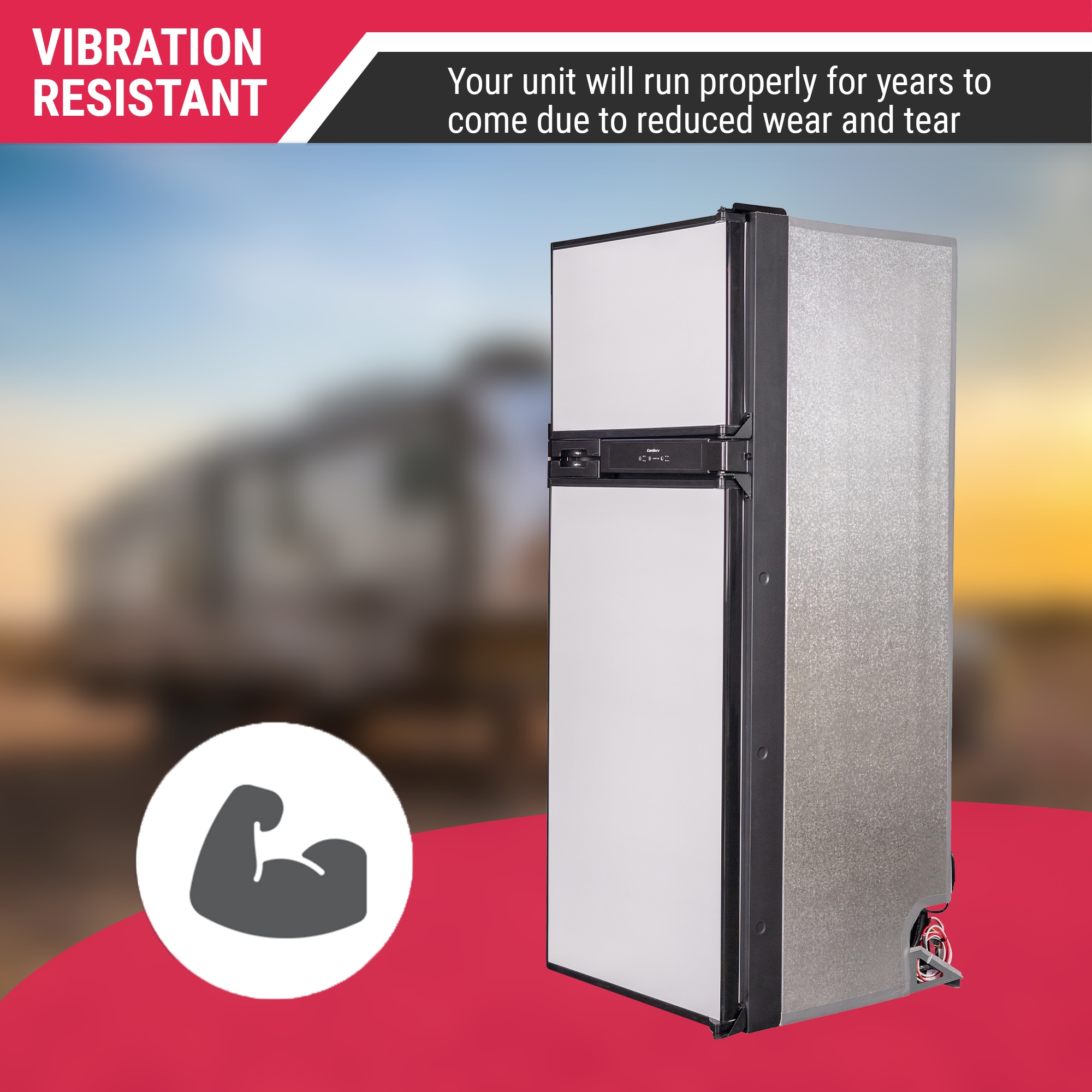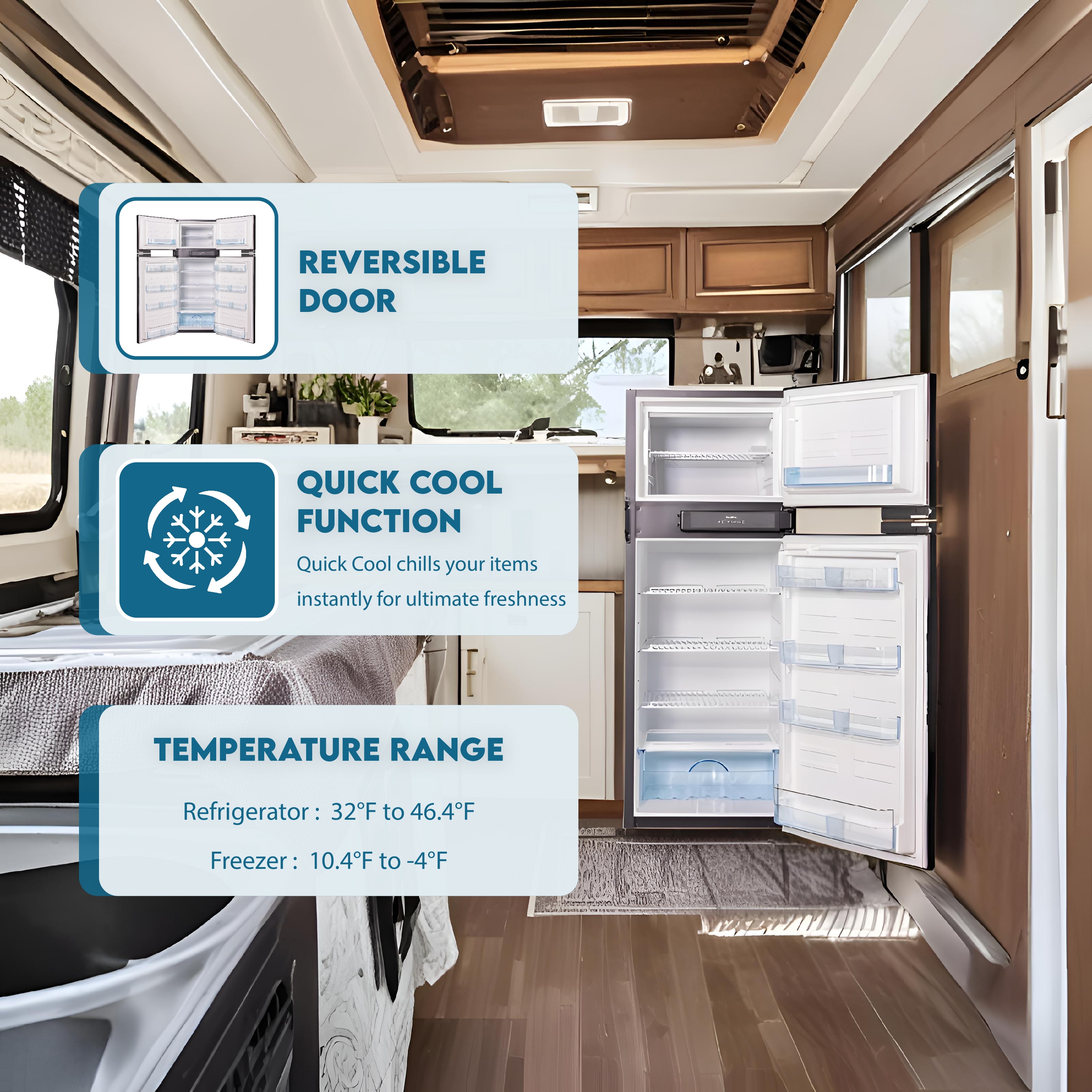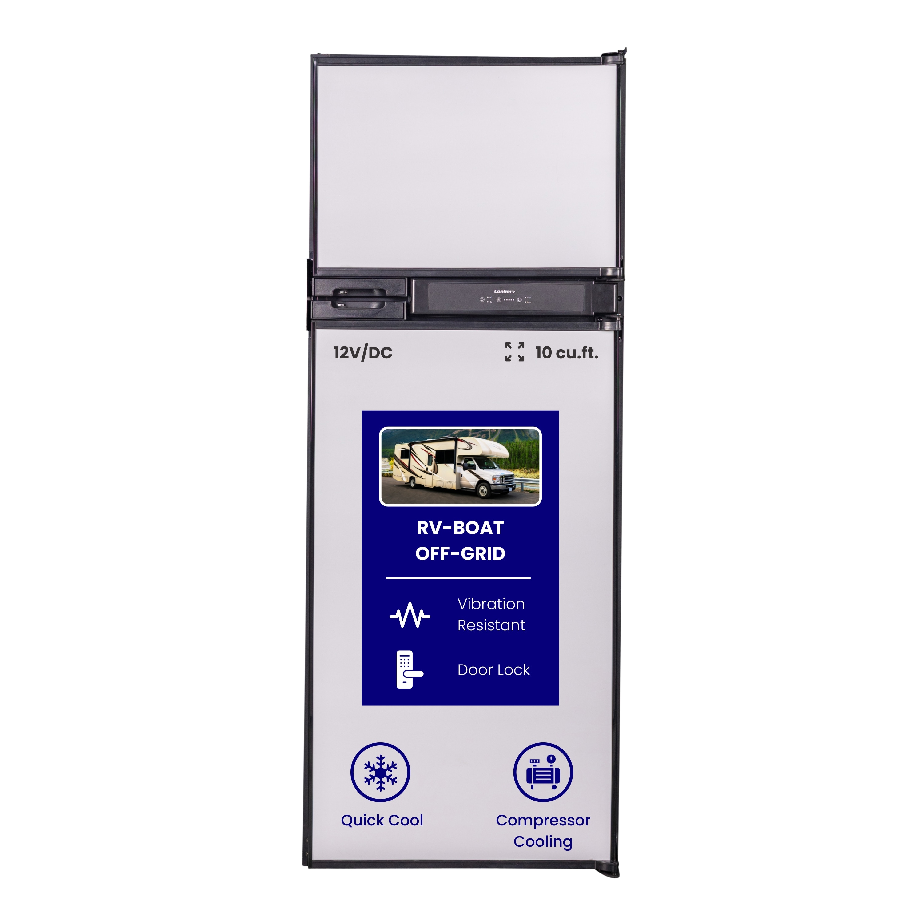 Keep all of your food and beverage items chilled to perfection in any size space with the Equator 12V DC RF 1012 Refrigerator. Designed for RVs, tiny homes, and off-grid houses, easily store everything from two-liter bottles to all of your produce for the week in 10 cubic feet of space. Equipped with vibration resistance, the unit will run properly for years to come due to reduced wear and tear. Enjoy organized storage with the built-in crisper, ice tray, bottle bin, and adjustable shelves. This freestanding or built-in model contains both a freezer and refrigerator, and measures 60 x 22.83 x 24.8 (HxWxD). Adjust the freezer temperature between 10.4°F and -4°F, and the refrigerator between 32°F and 46.4°F. Noteworthy features include a condenser, door ajar alarm, temperature alarm, door lock, reversible door, and bright interior LED light. Use this fridge/freezer combo as a freestanding or built-in unit. Backed by Equator’s one year parts and labor warranty, you can feel confident in the RF 1012’s long-term performance.