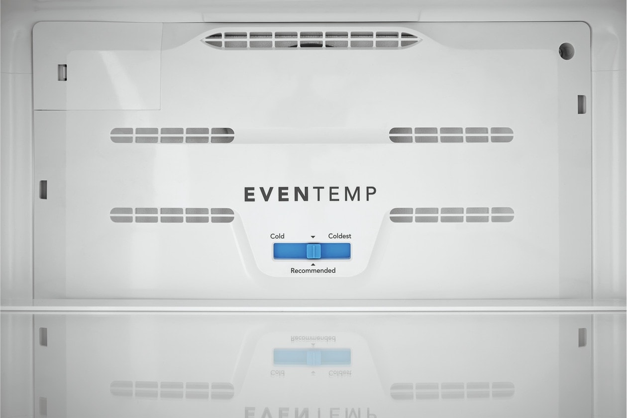This Frigidaire 18 cu ft top freezer refrigerator offers a timeless style with the latest cooling technology. Our EvenTemp™ Cooling System prevents unwanted freezing by optimizing airflow and ensures a consistent temperature throughout your refrigerator. The spacious interior storage enables you to easily organize your family’s favorites with two wire shelves, spacious door bins, and a full-width glass freezer shelf.
