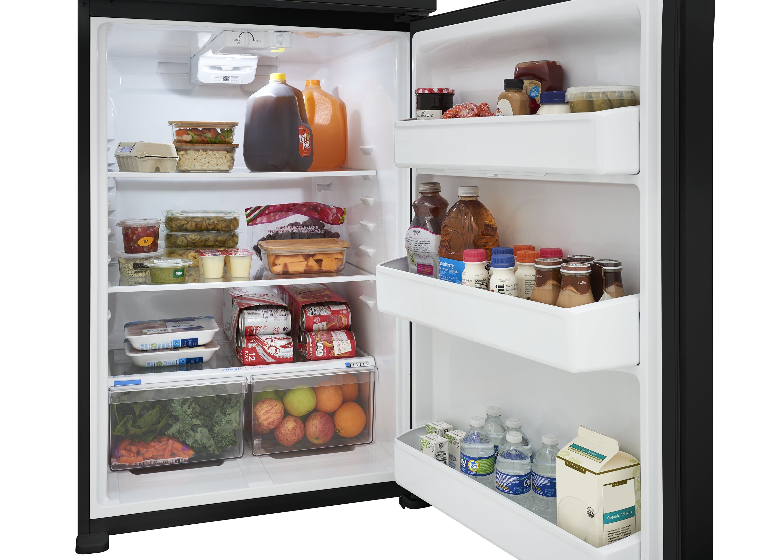 Find a place for everything with our spacious interior options designed for busy families, including two full-width glass shelves, gallon door bins, and glass freezer shelf