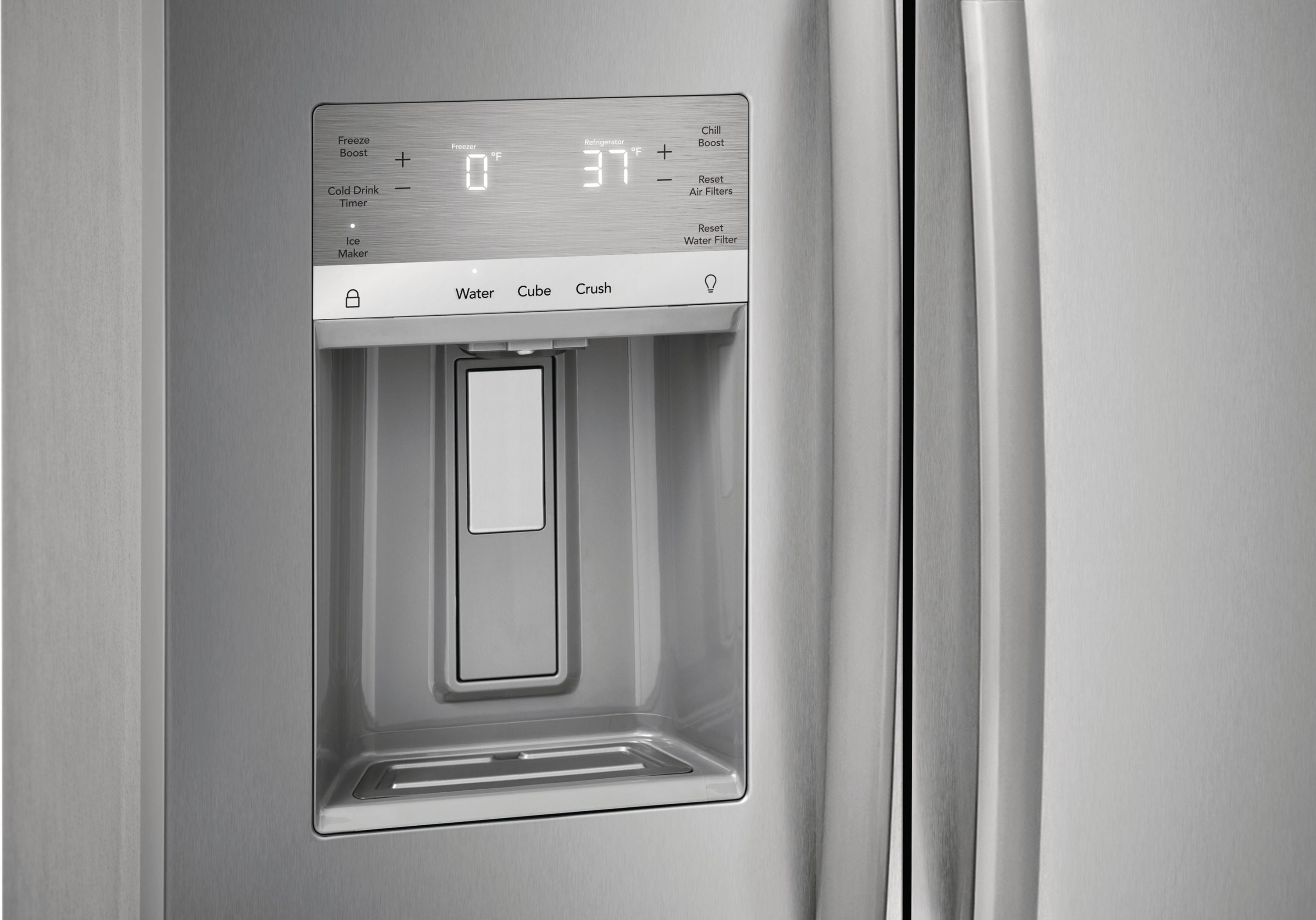 This Frigidaire Gallery 36-in side-by-side refrigerator offers our advanced CrispSeal plus crisper. This crisper keeps produce fresh with a seal that blocks out dry air, plus an added filter reduces the gas that causes produce to ripen faster. It also features our EvenTemp Cooling System which keeps your food fresh by reacting quickly to temperature fluctuations and constantly circulates cold air throughout the fresh food and freezer compartments, ensuring a consistent cool from top to bottom.