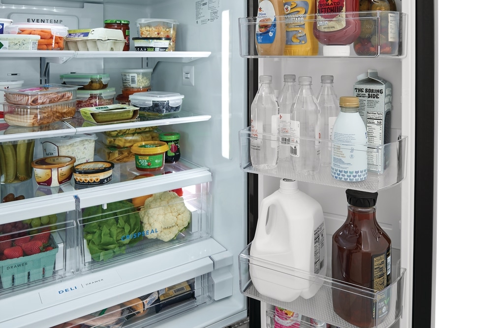 This Frigidaire French door refrigerator helps keep fruits and vegetables fresh longer with CrispSeal® crispers which blocks dry air from entering your crisper to avoid premature shriveling. Easily stay organized with a full width deli drawer and large door bin storage. Keep safe, great tasting water flowing. Our filter reduces up to 99% of contaminants, cuts back on plastic and saves the cost of bottled water (NSF and WQA certified).
