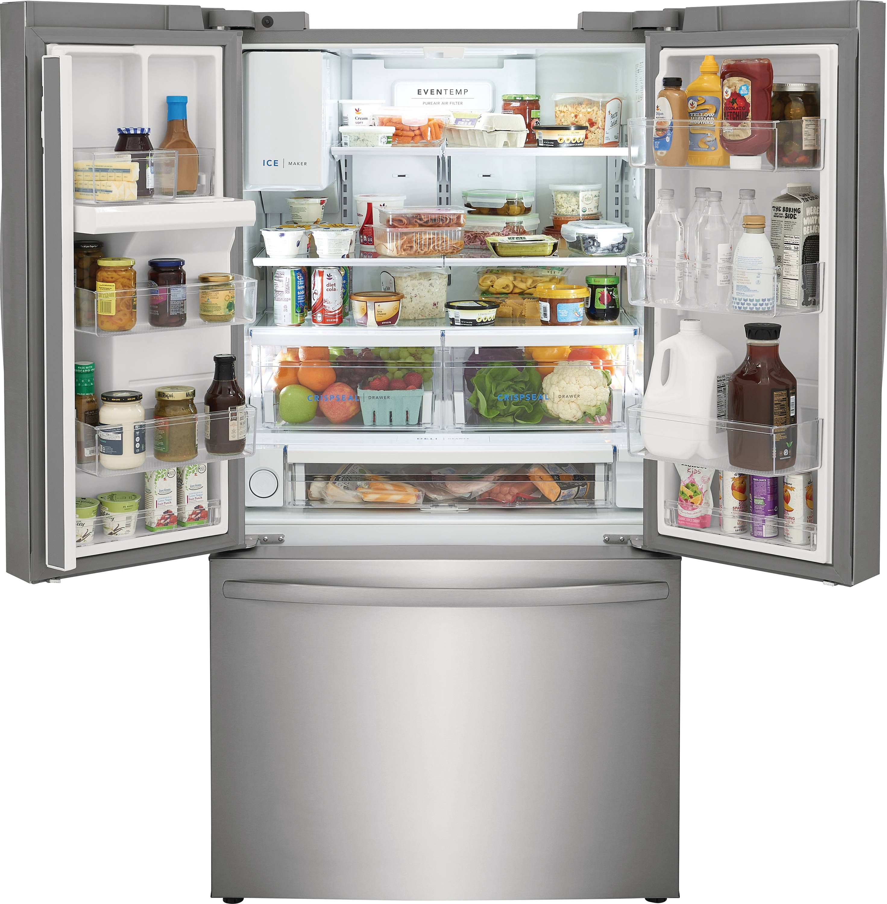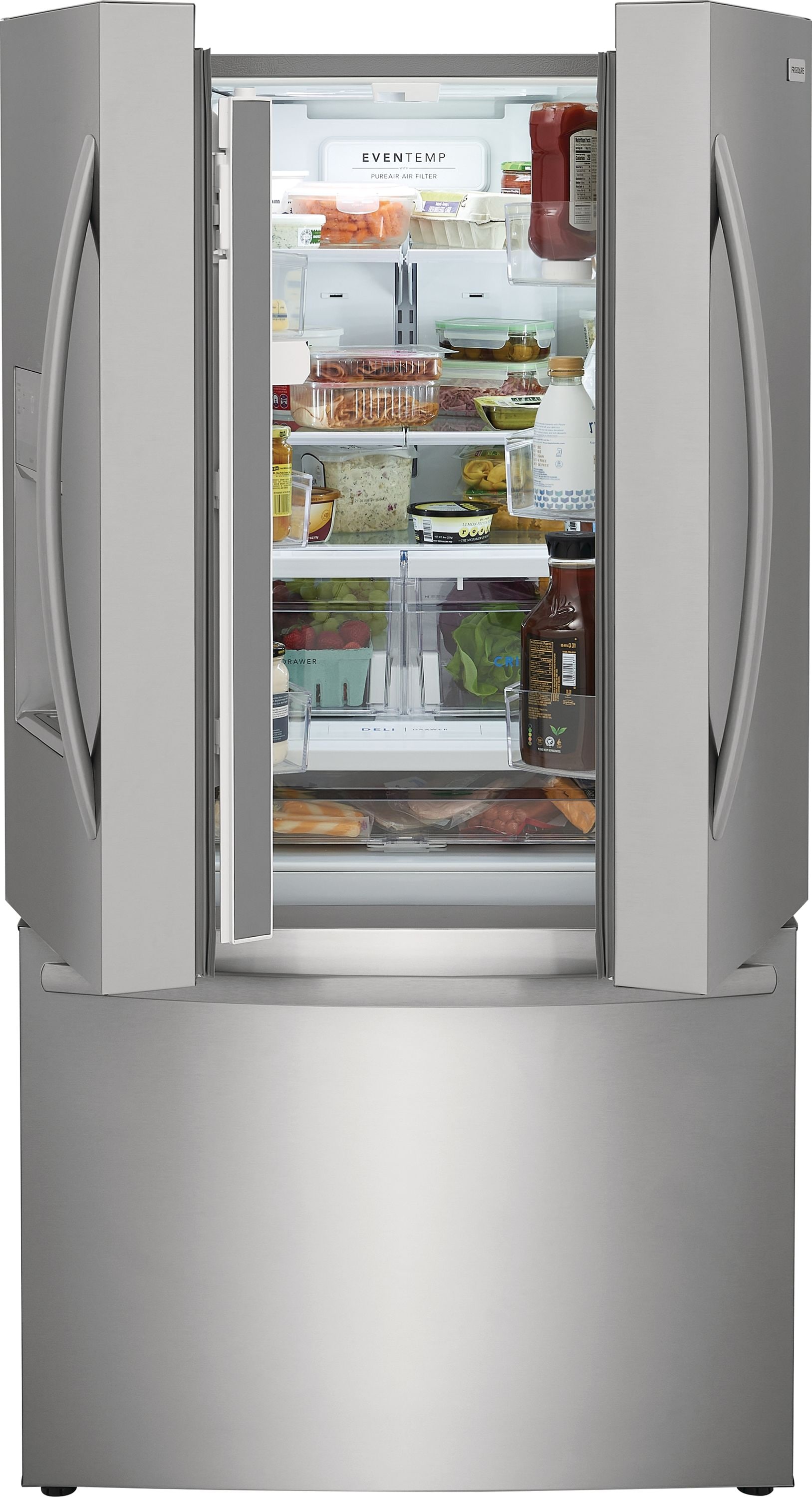 This Frigidaire French door refrigerator helps keep fruits and vegetables fresh longer with CrispSeal® crispers which blocks dry air from entering your crisper to avoid premature shriveling. Easily stay organized with a full width deli drawer and large door bin storage. Keep safe, great tasting water flowing. Our filter reduces up to 99% of contaminants, cuts back on plastic and saves the cost of bottled water (NSF and WQA certified).
