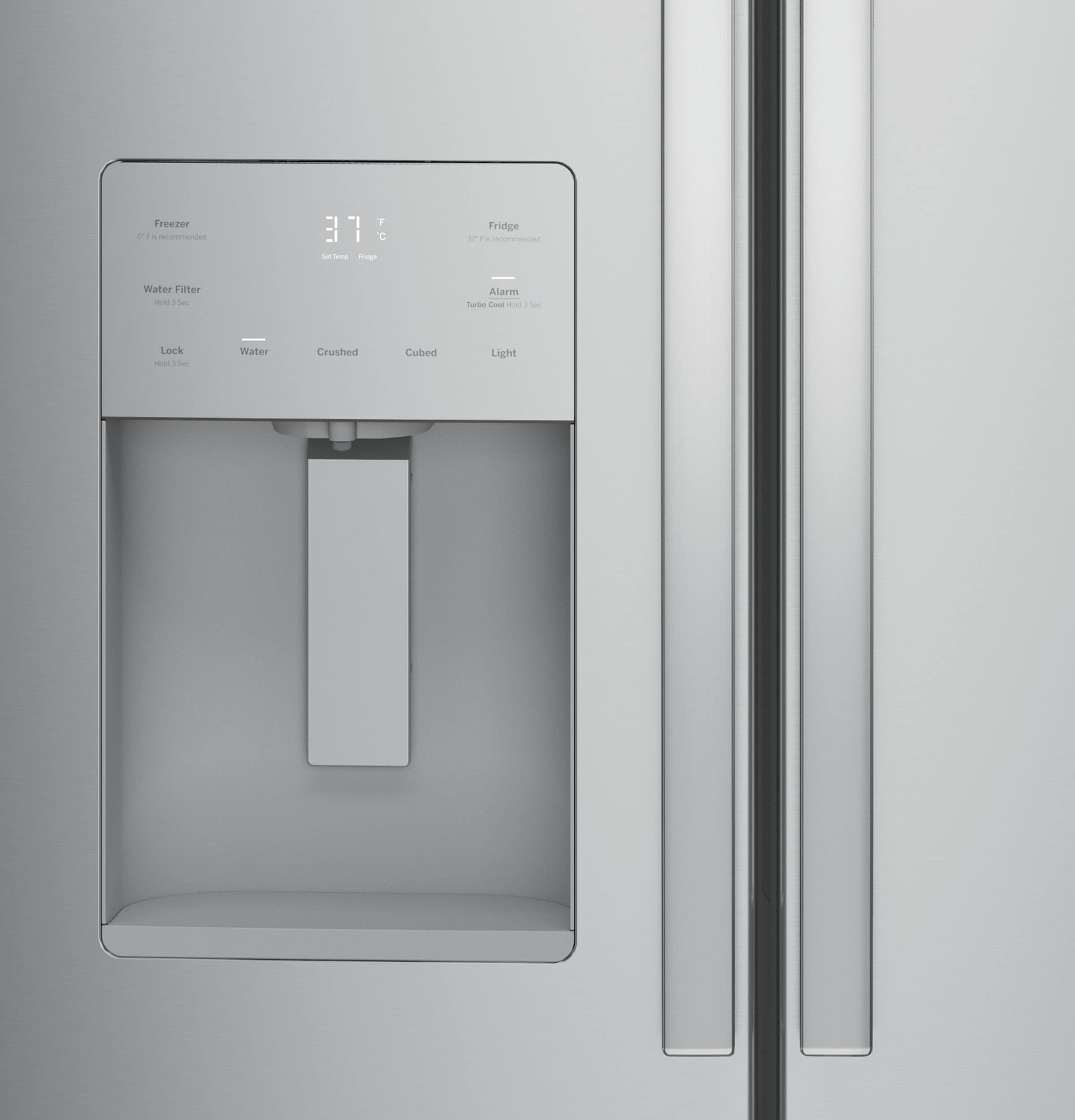 External controls with actual temperature display, child lock and door alarm – eliminates the guesswork in setting refrigerator temperatures; conveniently displayed on the dispenser