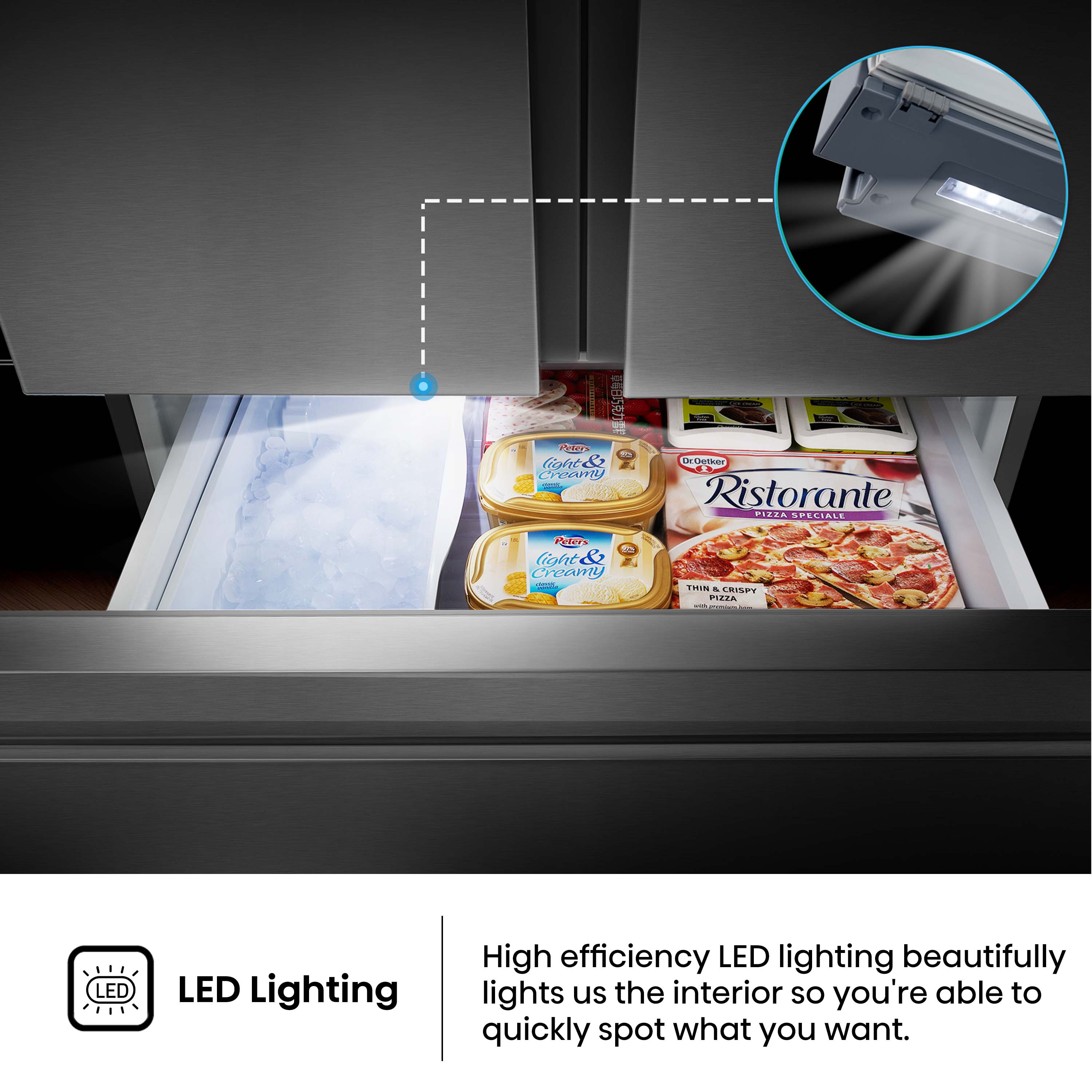 LED lighting in both the freezer and refrigerator helps you easily find whatever you’re looking for, even in the dark