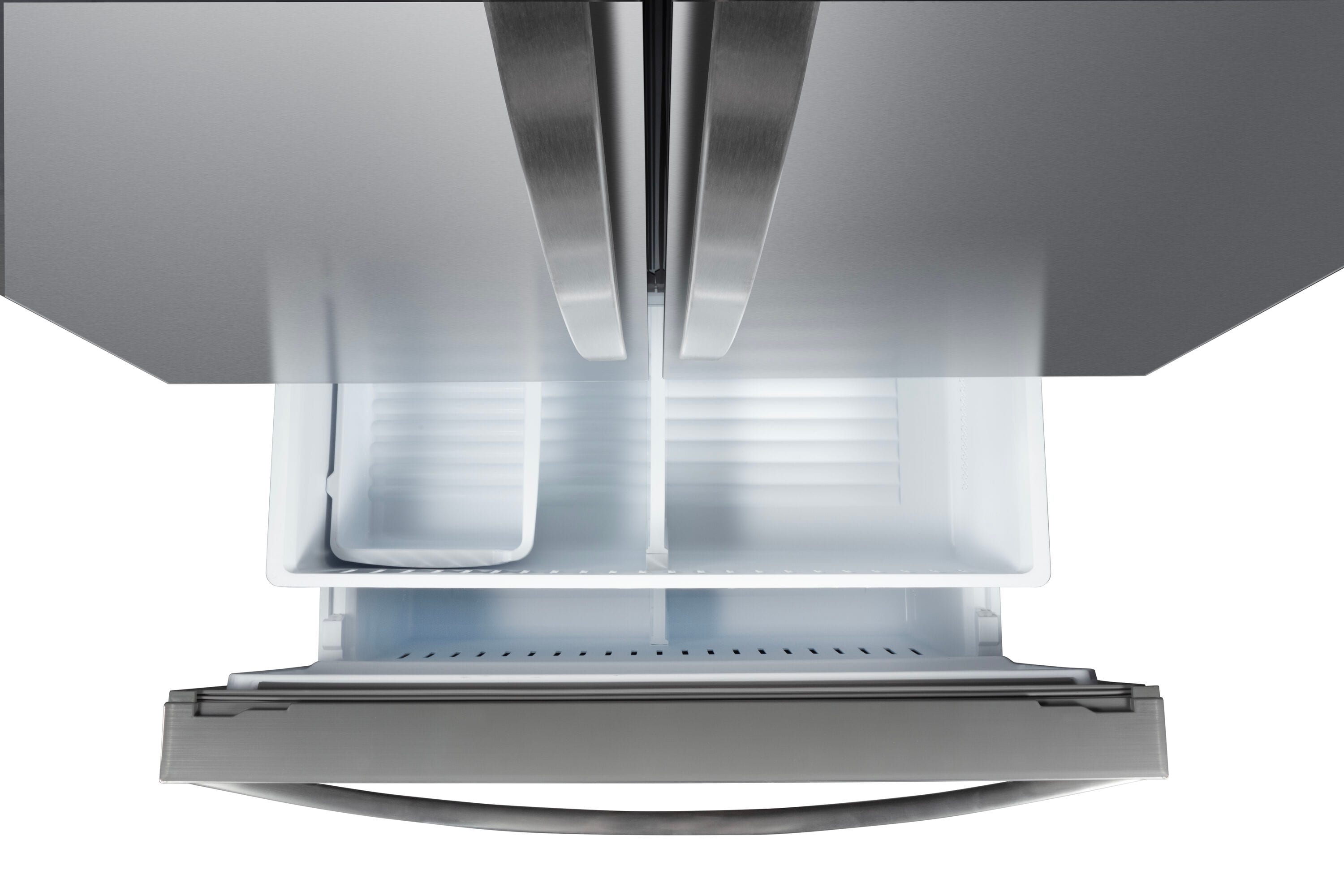 This fridge has 20.3 cu. ft. of storage space all with a compact footprint. Its counter-depth and gorgeous French door design makes it a great match for any kitchen. Fingerprint-resistant stainless steel keeps everything looking polished, and Accela Chill uses fan-forced cool air to accelerate cooling. Featuring adjustable full-width glass shelves, you can customize your fridge to fit taller bottles and make the most of your space. Humidity controlled crisper drawers are the perfect place to store fruits and veggies. Two, gallon-sized clear bins and the two-tier freezer organization provides easy and efficient storage. Full-width pantry drawer allows you to store deli trays and platters. With the inverter compressor, the fridge maintains a consistent temperature to keep food fresh and is also quieter, more energy efficient, and operates with less wear and tear than conventional compressors.