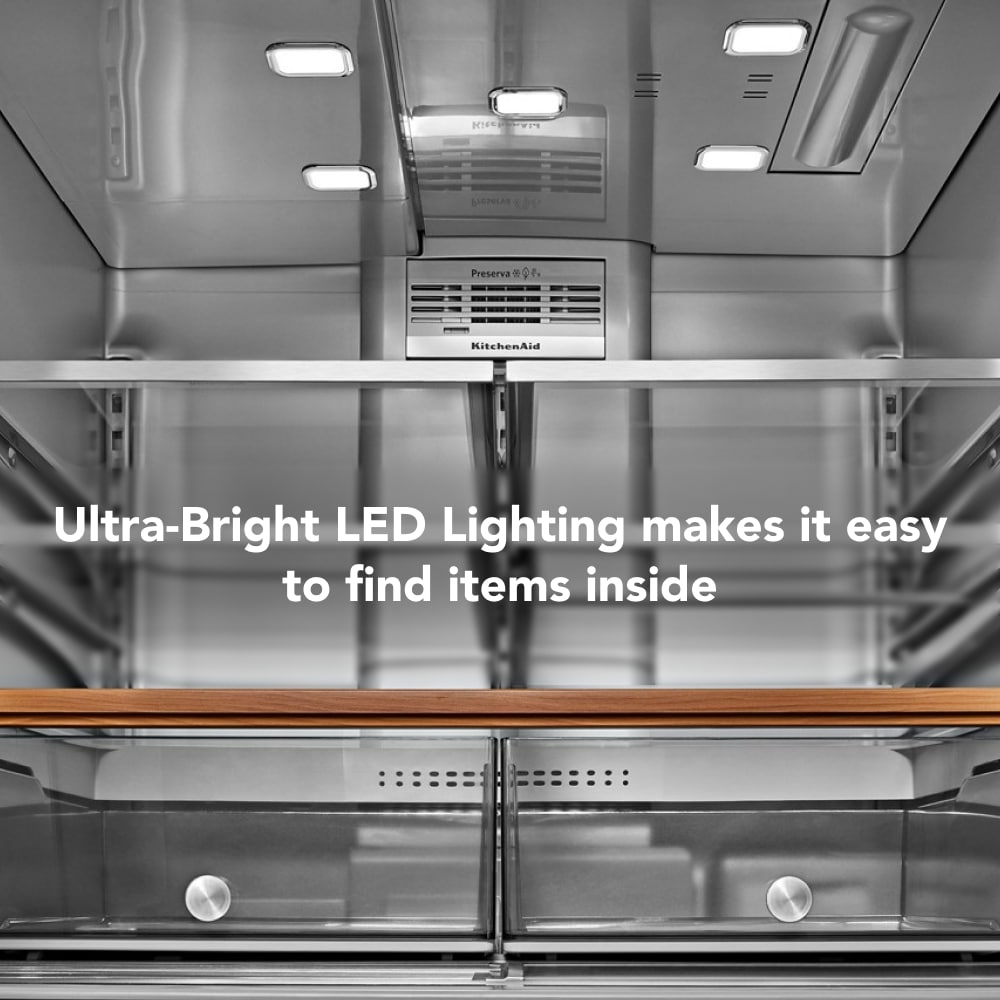 The difference is in the details. This KitchenAid® multi-door French door refrigerator has a Signature Platinum Interior that wows from the inside out with wood-look trim and metallic touchpoints. The FreshChill™ Full-Width Refrigerated Drawer lets you customize temperature settings for the items you reach for most. And a Three-Tier Freezer Drawer conveniently organizes frozen foods so they’re easy to find.