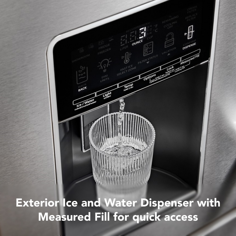 Exterior Ice and Water Dispenser with Measured Fill for quick access to ice and water