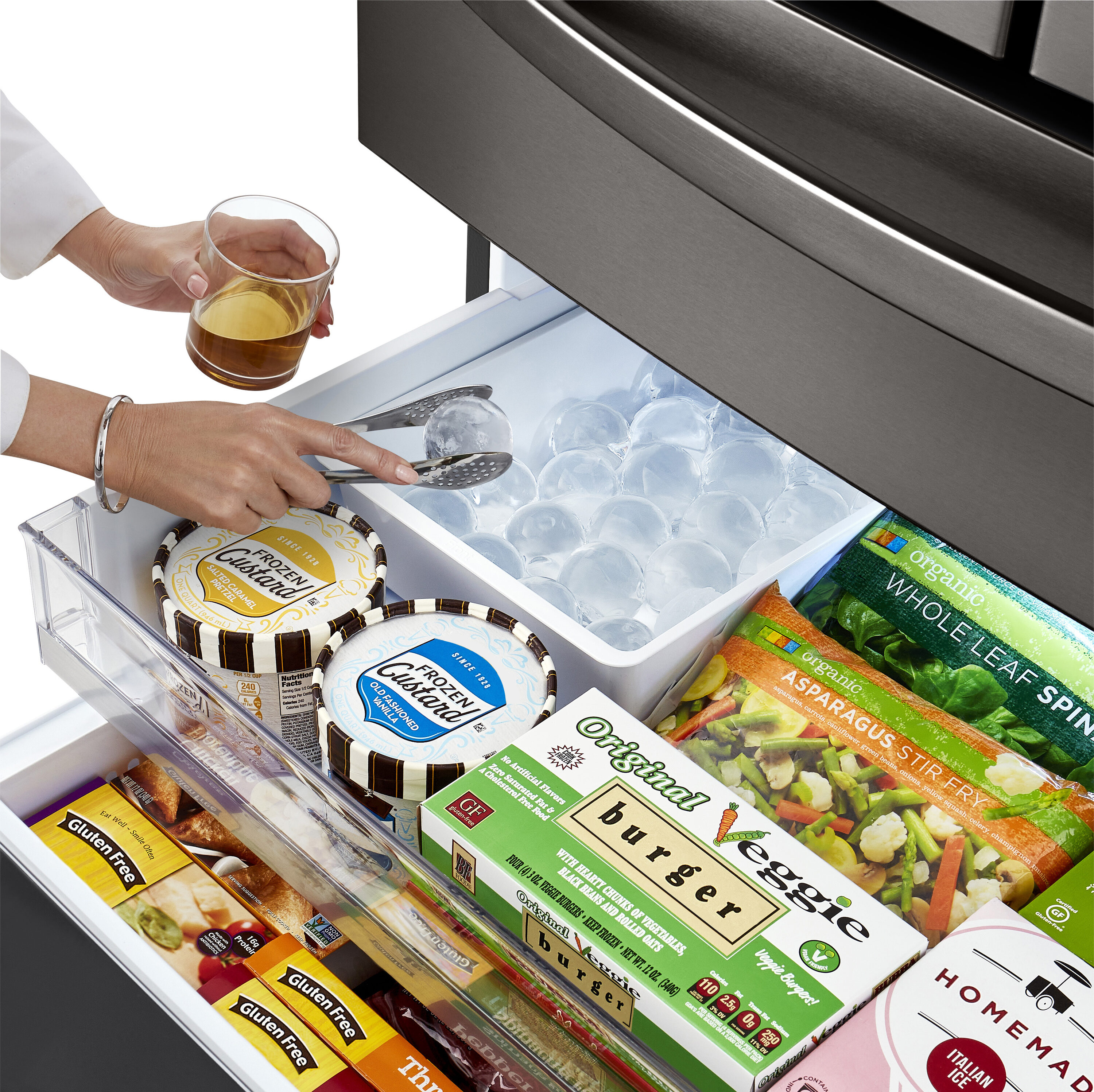 Dual ice makers automatically create standard ice cubes, crushed ice and slow-melting round Craft Ice for all your entertaining needs
