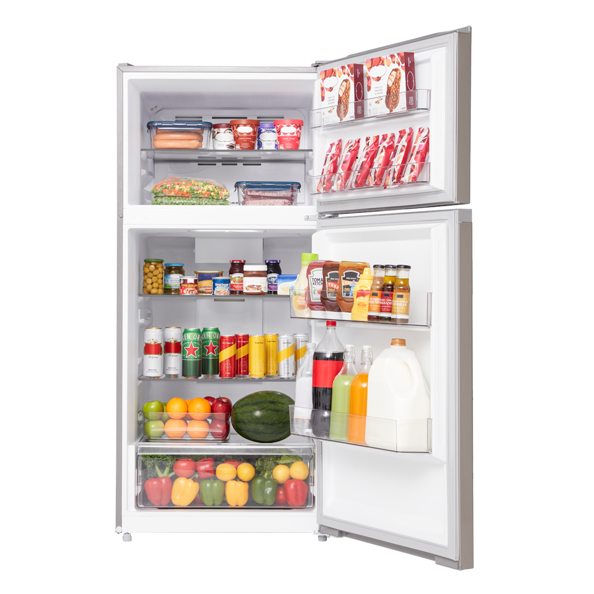 Upgrade your kitchen with the Midea 14.2-cu ft Counter-Depth Top-Freezer Refrigerator, which offers both a wide range of convenient features and energy-efficient performance. The internal LED lighting ensures that you can always find what you’re looking for, while the electronic control panel makes temperature adjustments a breeze. Humidity-controlled crisper drawers keep your produce fresh, and the reversible door allows for flexible installation. The top-freezer design puts frozen foods at eye level for easy access. Bring home this refrigerator today to optimize your food storage capabilities and keep your kitchen running smoothly.