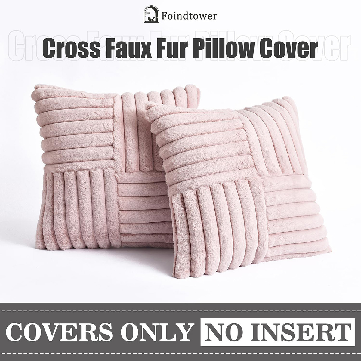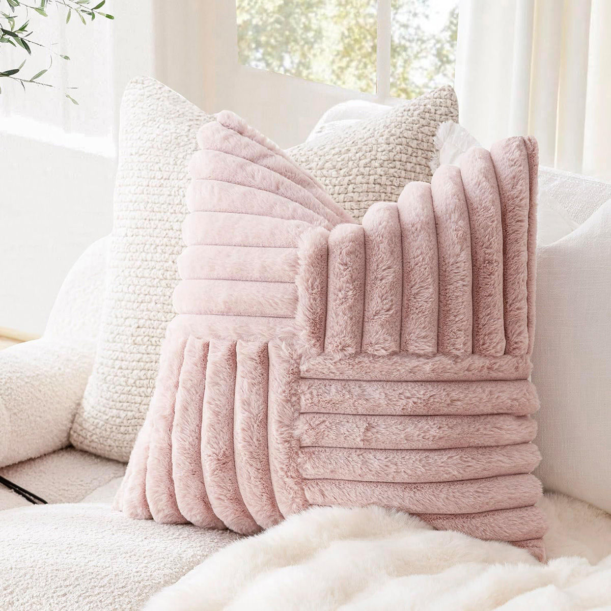 Pack of 2, Faux Fur Plush Decorative Throw Pillow Covers Soft Fluffy Velvet Cushion Case Cozy Fuzzy Striped Pillowcase Home Decor, Dusty Pink