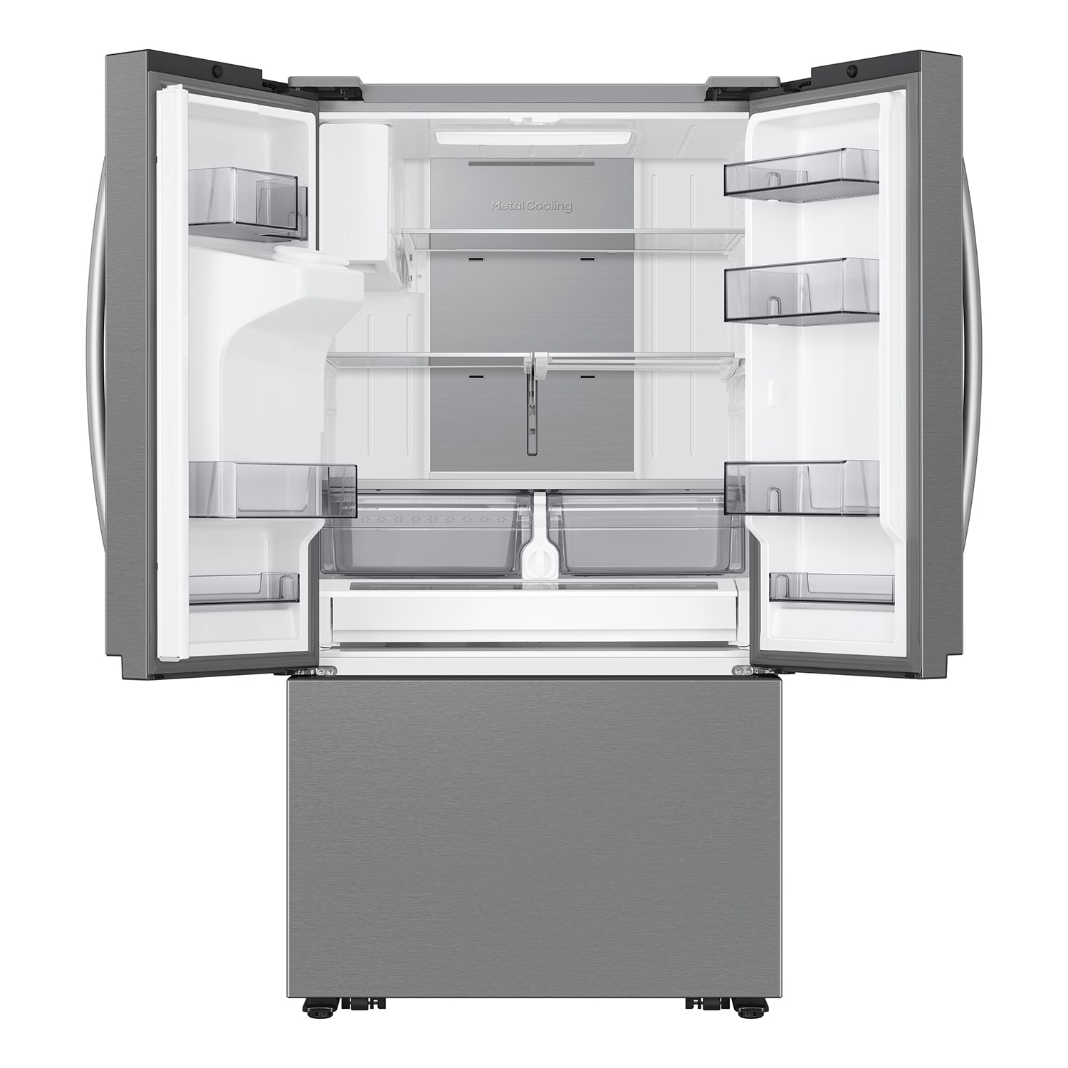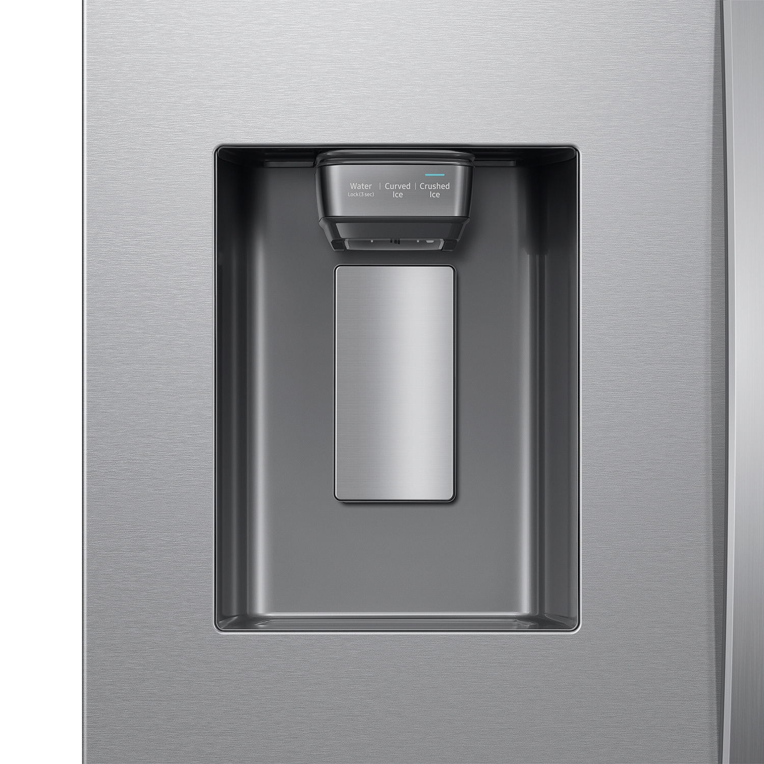 Samsung Mega Capacity 3-Door French Door Counter Depth refrigerator with 26 cu. ft. comes with four types of ice and modern design. Store more groceries, including big and bulky items. The Dual Auto Ice Maker makes two types of ice – cubed or Ice Bites™ while the external dispenser offers two additional ice options, curved and crushed.