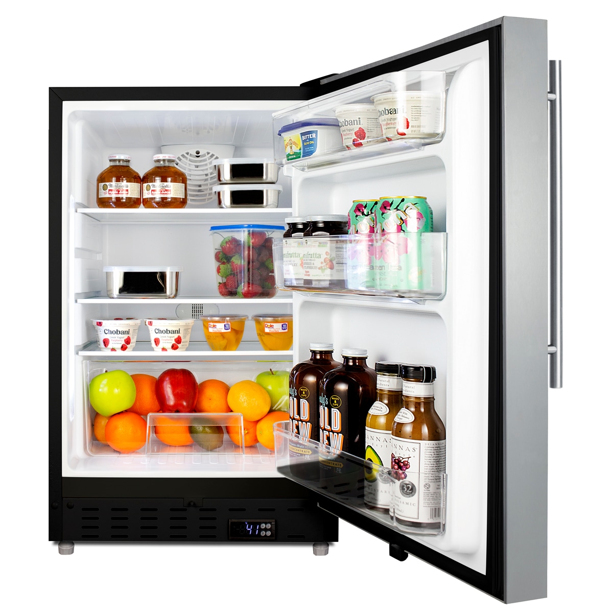 Summit Appliance offers a quality selection of 21″ wide built-in undercounter all-refrigerators designed for installation under lower ADA compliant counters, with advanced features for user convenience.The ALR47BSSHV is sized at 32″ high to fit under lower counters complying with ADA guidelines for accessibility. The fully finished textured black cabinet allows freestanding use, while the front-breathing system means this unit can be built-in with minimum clearance. The user-reversible, stainless steel door is 3″ thick for efficient insulation, with a sleek vertical handle with a thin 14mm diameter, a popular style that matches many common cabinet handles. This unit comes with a right angle cord to allow for easier placement without added depth. A digital thermostat, located in the kickplate, makes for easy temperature management with a readout in Fahrenheit or Celsius. Inside, the ALR47BSSHV features an all-white interior for easy cleaning and viewing of contents. An LED light located toward the front of the unit attractively illuminates the interior when the door opens. Automatic defrost operation ensures minimal user maintenance, with an internal fan to help ensure even cooling throughout the 3.53 cu.ft. interior. Three adjustable glass shelves offer optimal storage options for large and small items, while a pull-out crisper drawer provides storage for fruits and vegetables. Three removable door racks accommodate additional storage as needed. The user-set high and low-temperature alarms provide added security should the temperature go beyond the setpoint, while the open door alarm sounds if the door is ajar over one minute for added peace-of-mind. These alarms can be disabled depending on your needs. Sized at just 21″ wide, the ALR47BSSHV is the perfect addition for space-challenged environments seeking dependable freezer options in a durable design.