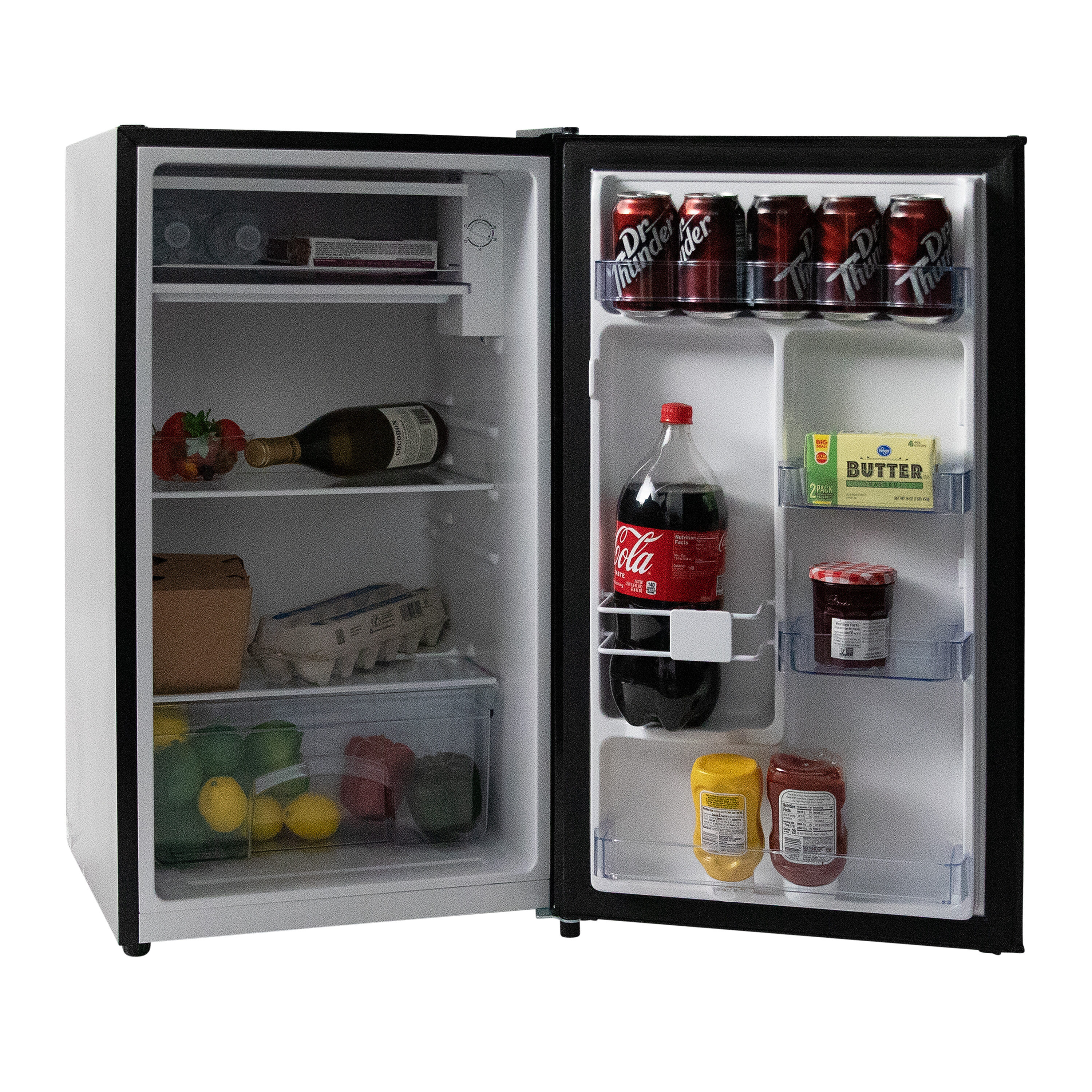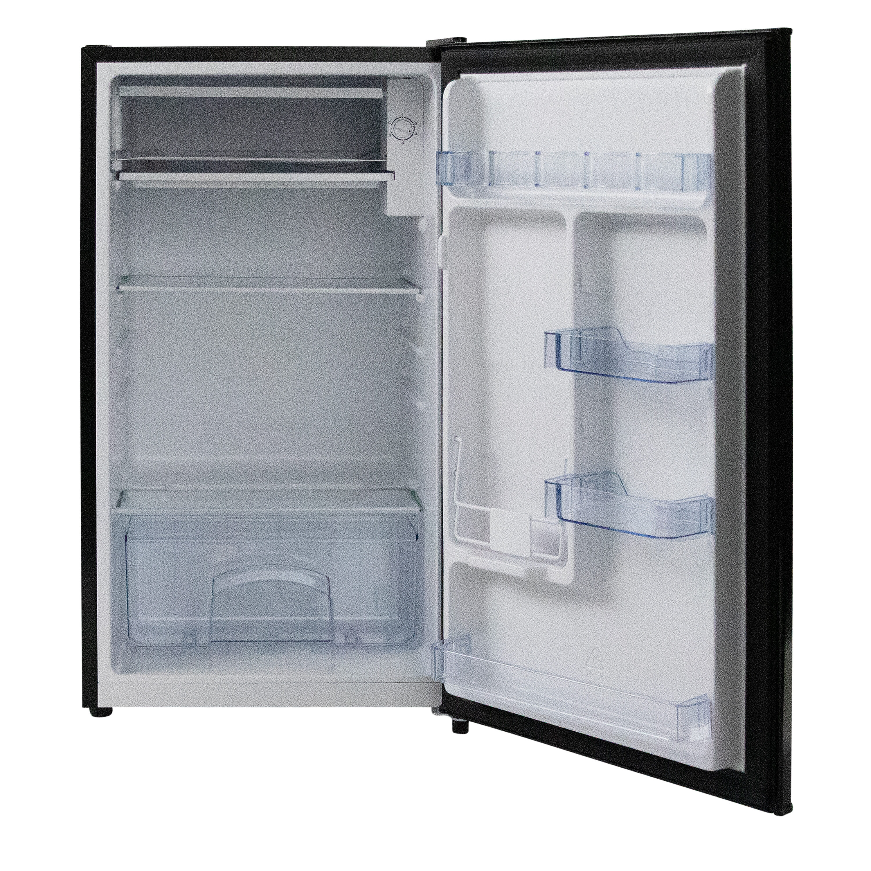 Keep your favorite beverages and snacks close by in the 3.3 cubic foot refrigerator from West Bend. Ideal for anywhere you need a little extra refrigerator space, the compact size makes it the perfect mini fridge for the office, dorm, man cave, she shed, bar, bedroom and more. Stock the mini fridge with bottled water and soda cans or try using it as a dedicated beer cooler or wine fridge. Adjustable door bins can accommodate 2 liter bottles as well as other drinks, condiments and more. Arrange the adjustable glass shelves to store salads, fruits, snacks and other food for easy access throughout the day. This black mini fridge features manual defrost, so your food and beverages remain fresh and cold. Select the right settings for your items with the full range temperature control. With a recessed door handle, flush back design and reversible door, this compact refrigerator is the perfect choice for any small space.