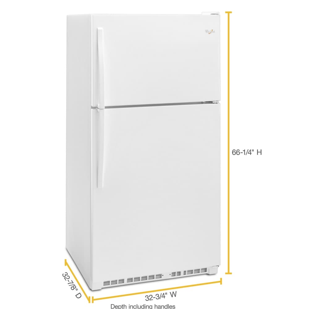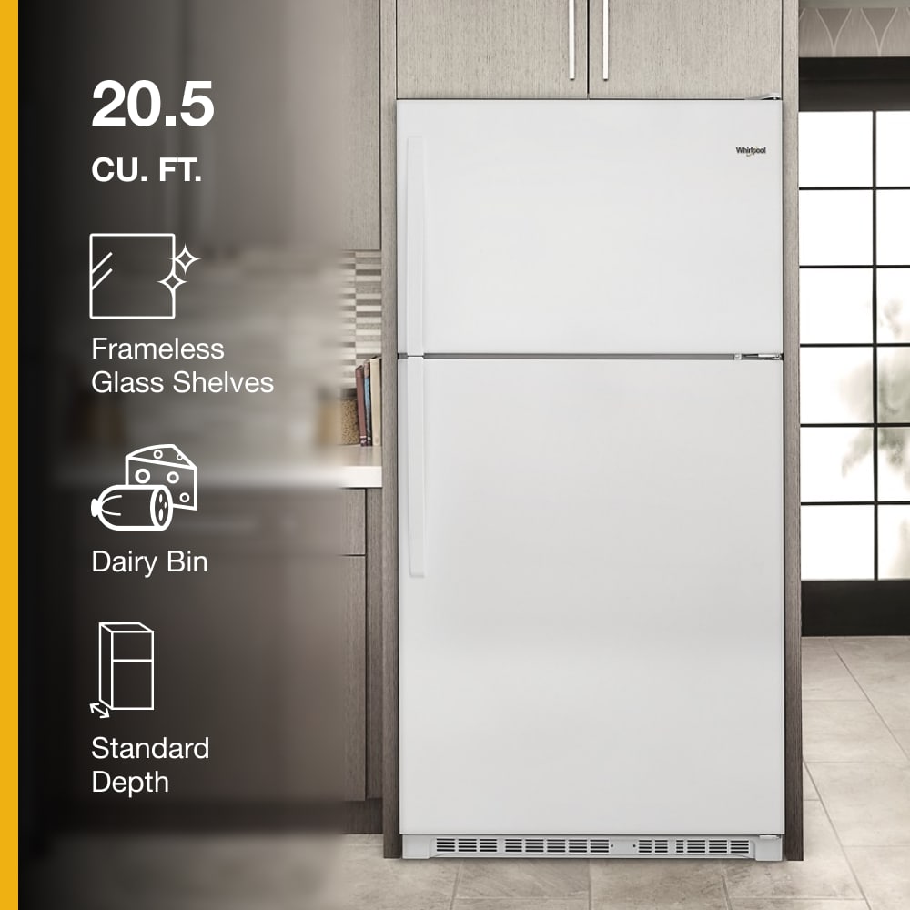 Do you like your freezer at eye level? This classic Whirlpool 20 cu top-freezer refrigerator is sized to fit the fresh foods, beverages, and frozen items your family loves. Purposeful storage features like a separate dairy bin and side bin that flexes to accommodate larger items simplify the task of figuring out where to put your groceries.