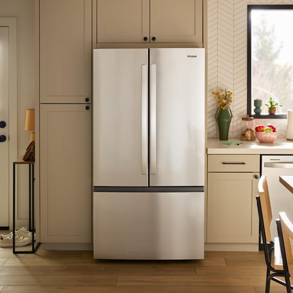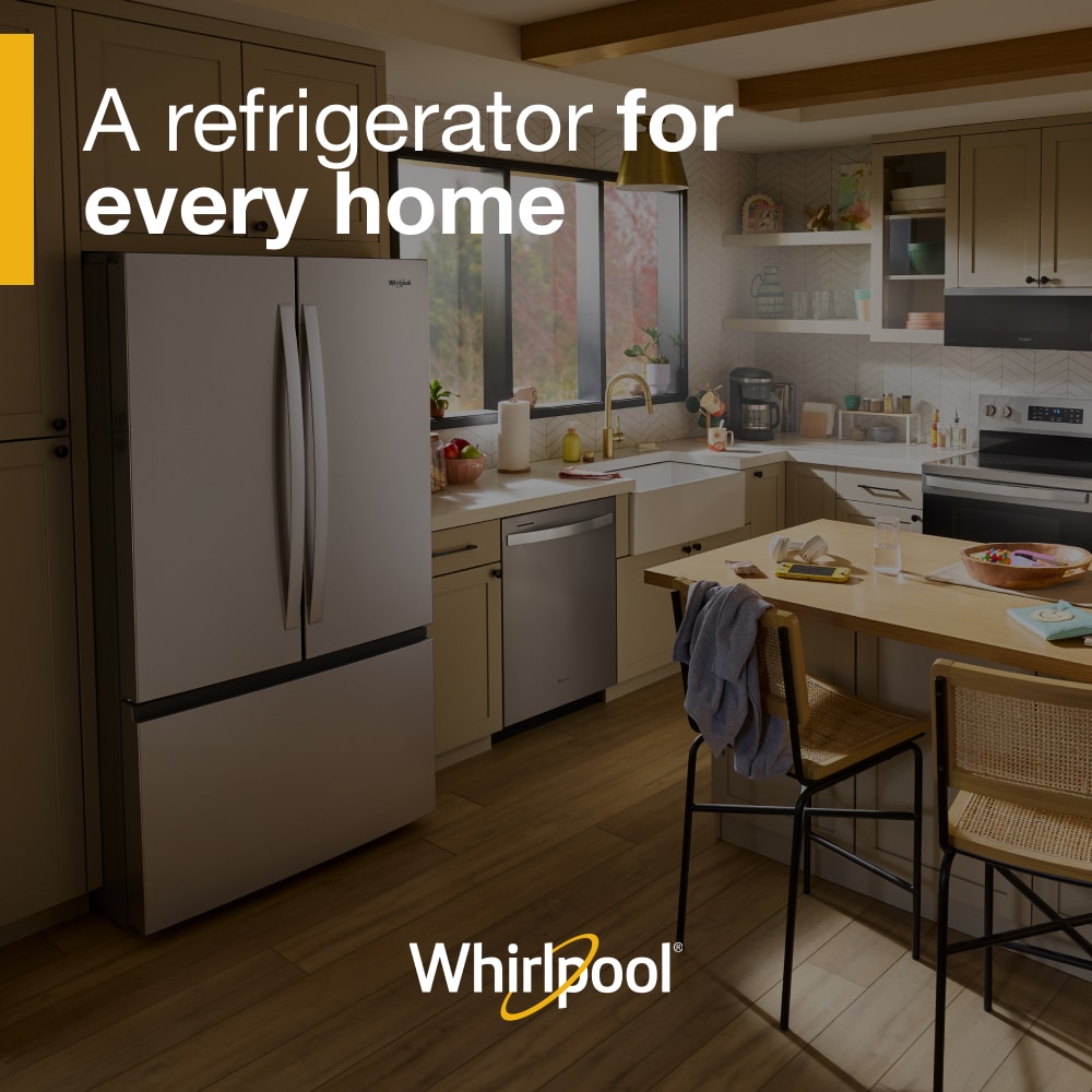 Get family-sized capacity, ice and flexible organization to keep up with whatever the day brings. This Whirlpool® French Door Refrigerator has Large Capacity Ice Production that makes over 3 lbs of ice every day. Pint-Size Storage provides easy access to small items. And half and full Adjustable Glass Shelves deliver flexible storage. ENERGY STAR® certified.