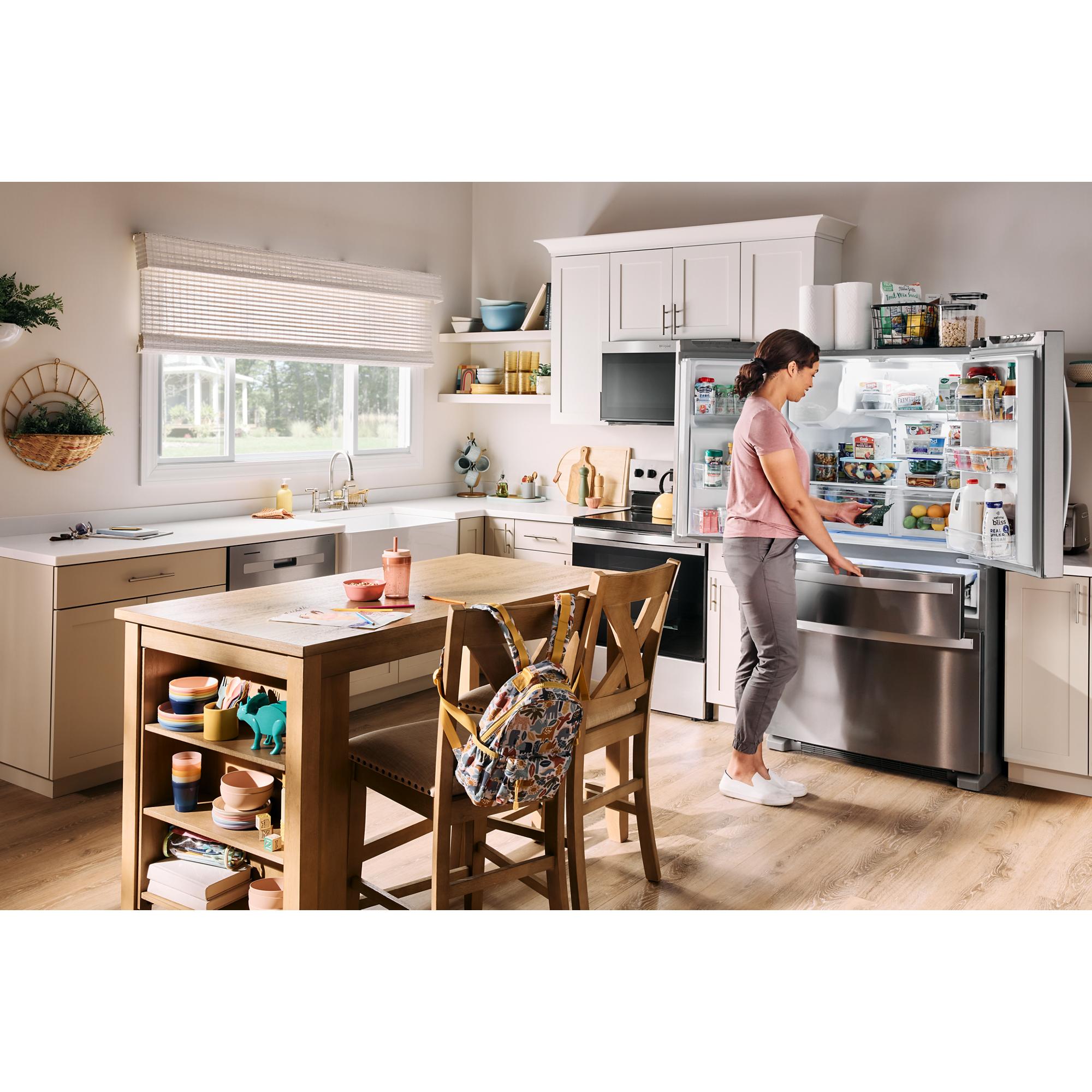 This French Door refrigerator with In-Door-Ice® and Water gives you the storage you need with the flexibility you want. With features like a Refrigerated Exterior Drawer, keep items you use most within reach. Need ice? No French Door Bottom Mount Refrigerator in-door ice maker holds more ice. Get instant access to freshly filtered water and ice without opening the door. Adjustable Shelves and Gallon Door Bins easily move up or down to help make room for tall items while keeping everyday items in sight.