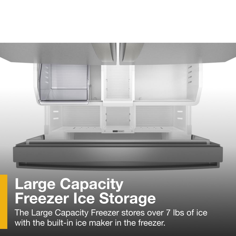 Get family-sized capacity, ice and flexible organization to keep up with whatever the day brings. This Whirlpool® French Door Refrigerator has makes over 3 lbs of ice every day. Fill up quick with the In-Door Filtered Water Dispenser & Ice Maker. Pint-Size Storage provides easy access to small items. And enjoy flexible storage with half and full Adjustable Glass Shelves. ENERGY STAR® certified.