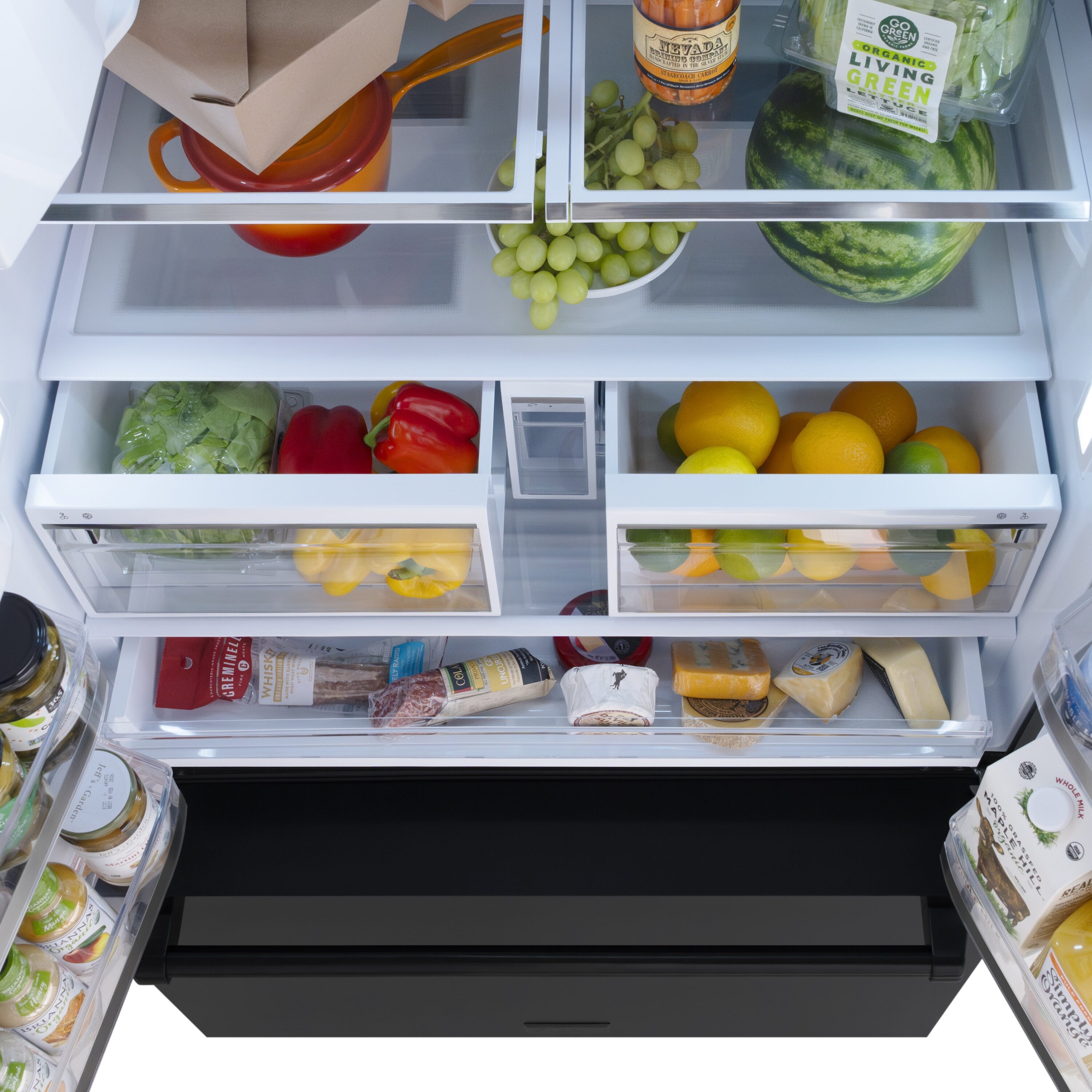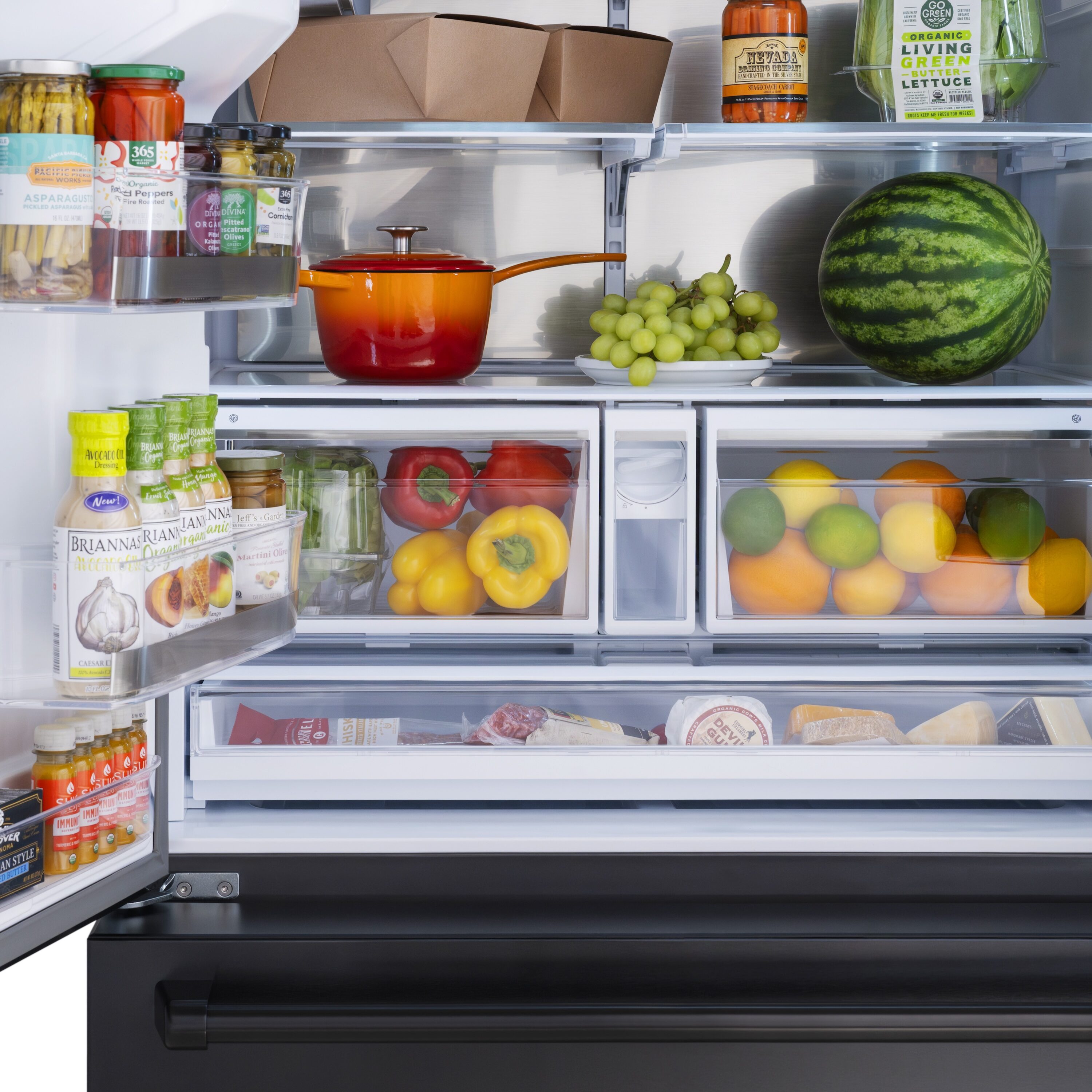 Crisper and Pantry Drawers – Enjoy best-in-class freshness for fruits and vegetables with a pair of half-width humidity-controlled crisper drawers, along with a full-width pantry drawer that provides substantial storage for produce, meats, and other items you want to keep fresh longer
